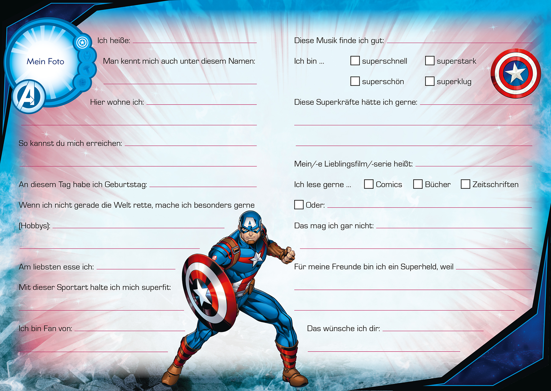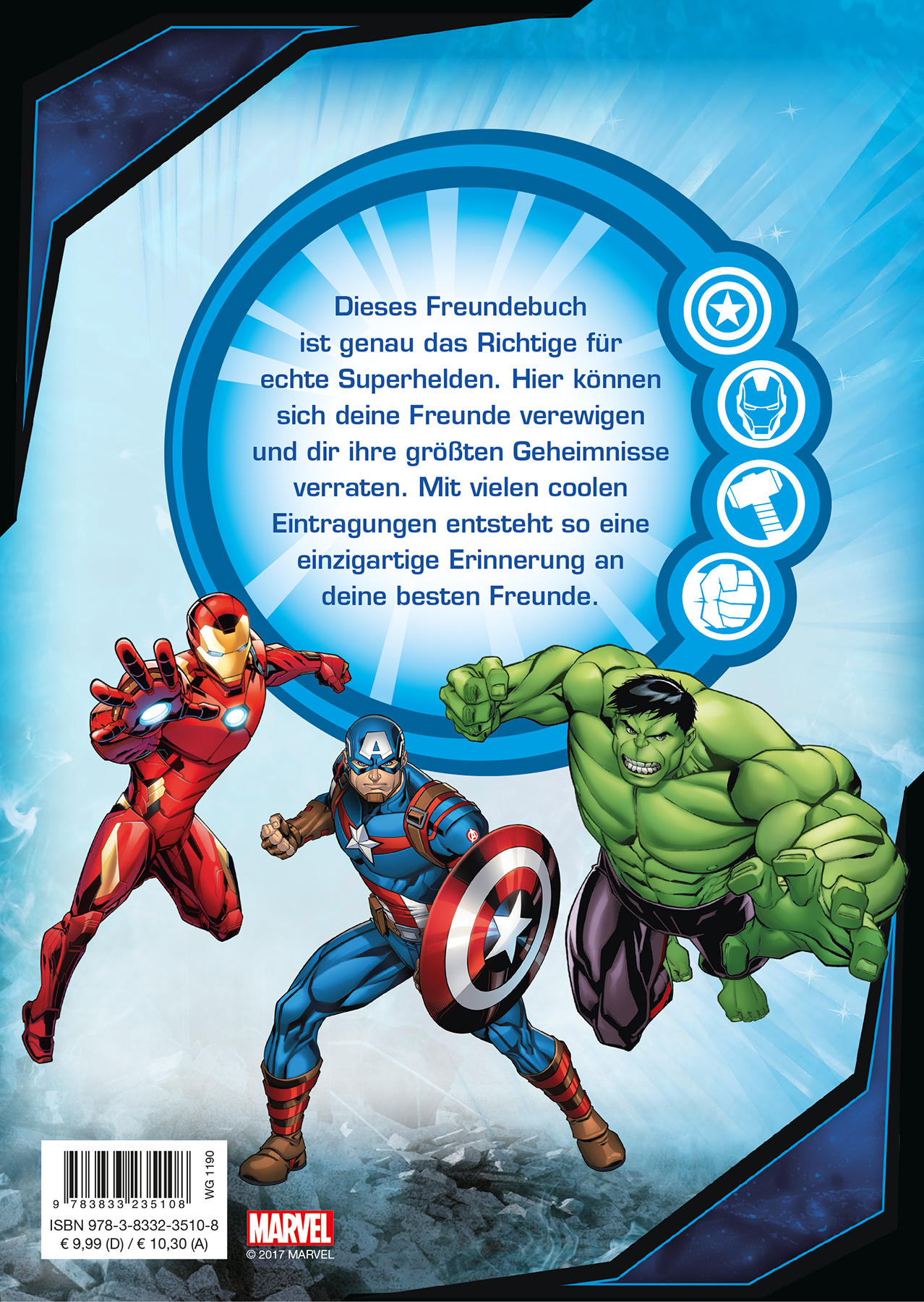 | Schlagworte | Animationsserie • Avengers • Comic • Erinnerungsalbum (Papeterie) • Freundealbum • Freundebuch • Freundebuch für Jungs • Freundebuch (Papeterie) • Freundschaftsbuch • Geschenkbücher • Interaktive Bücher, Mitmachbücher • Kindergeschenkbücher • Kinder/Jugendliche: Jahrbücher • Marvel • Superhelden • Superheldenfreundebuch • Zeichentrick |