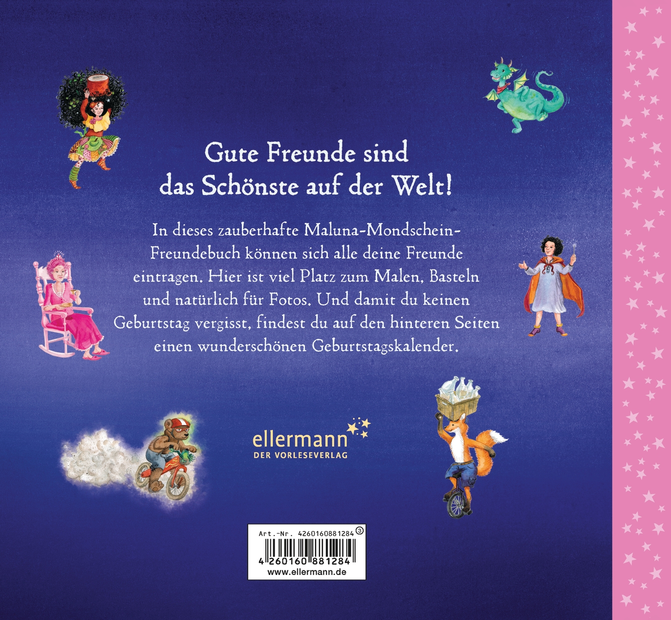 Ein wahrhaft zauberhaftes Freundebuch. In diesem zauberhaften Freundebuch haben alle Maluna-Fans Platz zum Malen und sicher auch viel Spaß beim Beantworten der lustigen Fragen! Jede Doppelseite wird durch andere Lieblingscharaktere aus den Büchern mit Leben gefüllt. Die Freundebuch-Besitzerin hat ihre eigene Eintragsseite und Maluna natürlich auch. Und mit dem Geburtstagskalender, auf den hinteren Seiten des Buches, kann kein Geburtstagskind mehr vergessen werden. Ein Muss für alle Maluna-Fans mit viel Platz zum Malen, Basteln und Kleben - ideal für Kindergarten-Kinder. Mit Nachtleuchtfarbe und Feenstaubglitzer auf dem Cover.