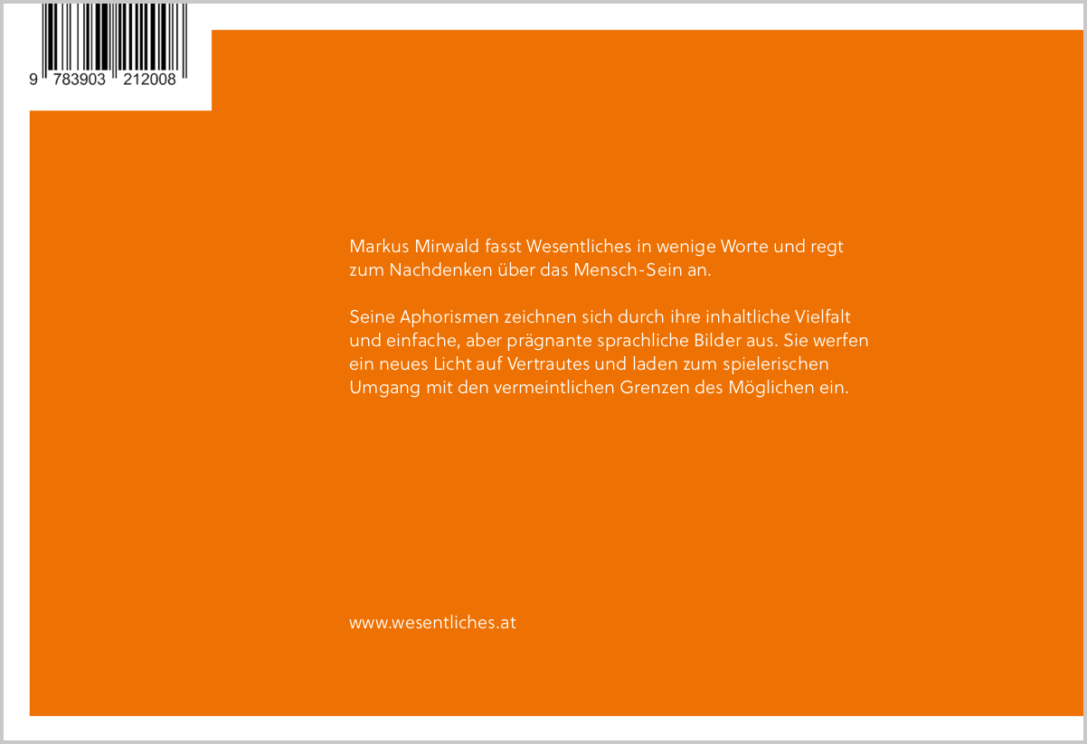 Markus Mirwald, 1982 in Vorarlberg geboren, ist Autor zahlreicher Aphorismen, die seit 2017 in mehreren Bänden erscheinen. Nach der Ausbildung zum Orgelbauer absolvierte er das Studium der Soziologie. Reisen durch Europa und Südamerika folgten Aufenthalte in Afrika, im Nahen Osten und ein Jahr in Nordamerika. Seine Beschäftigung mit dem Wesen des Mensch-Seins und des sozialen Miteinanders spiegelt sich nicht nur in seinen Werken, sondern führte auch zum Aufbau eines Cohousing-Projekts. Der Autor arbeitet im Bildungsbereich und lebt mit seiner Familie in der Nähe von Wien. In seinen Texten stellt Markus Mirwald die Frage nach dem Wesentlichen und lässt scheinbar Vertrautes in neuem Licht erscheinen. Seine Einladung zum Perspektivenwechsel geht mit dem Wunsch einher, die Grenzen des Denk- und Machbaren zu verschieben und seine Leserschaft zur Veränderung zu inspirieren. Sein Schreiben folgt dem Gedanken: Verändern wir unseren Alltag, wandelt sich unser ganzes Leben. Weitere Informationen zum Autor: www.wesentliches.at