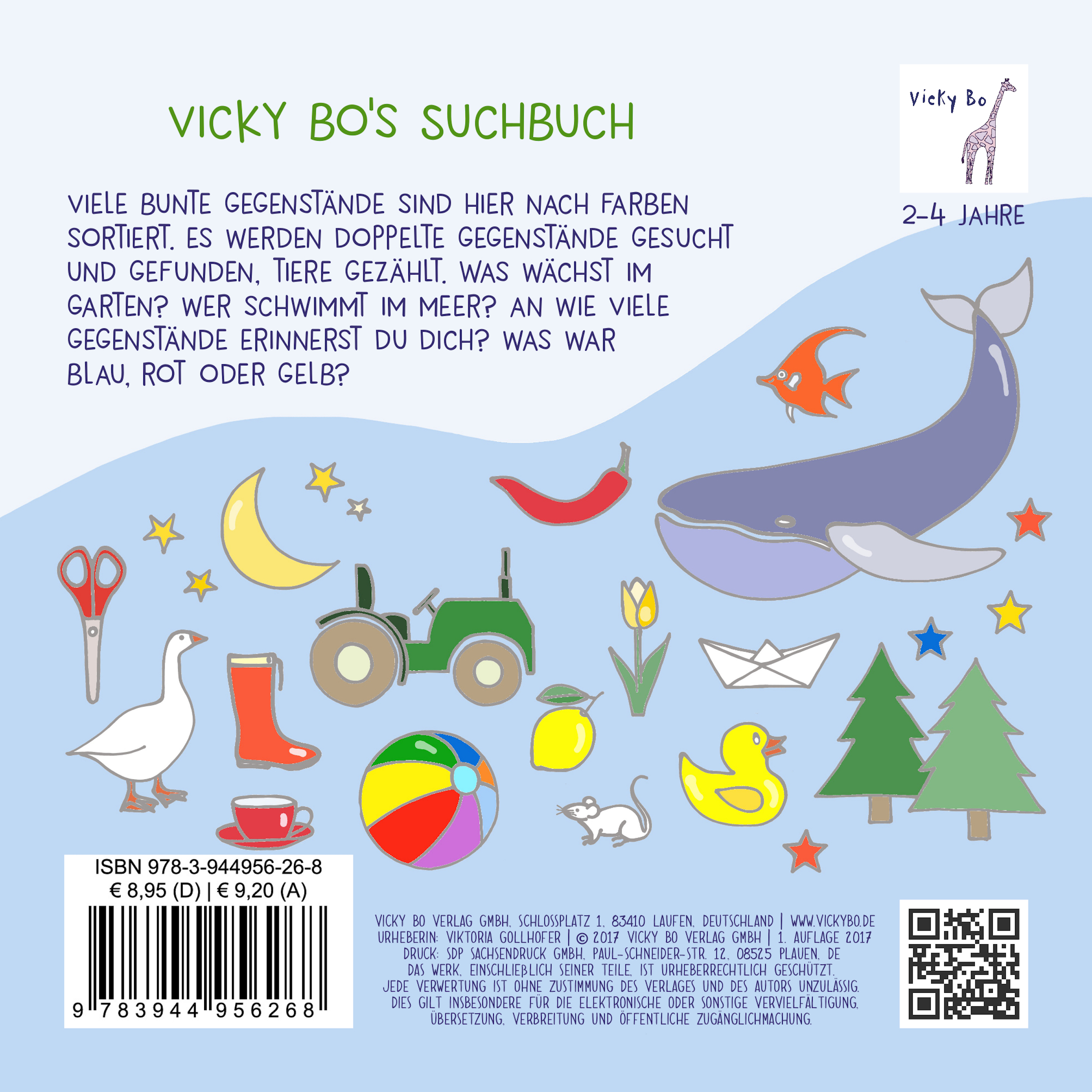 Vicky Bo's Suchbuch ist das perfekte Bilderbuch zum selber blättern. Das Motto ist: Schauen, staunen und darin versinken. Immer wieder entdecken wir etwas neues und für die Fragen findet sich schnell ein begeisterter Vorleser. Da ist aber viel los auf jeder Seite. Kennst Du schon jeden Gegenstand beim Namen? Die Dinge sind nach Farben geordnet und auf jeder Doppelseite gibt es Fragen, die du vielleicht schon beantworten kannst? Welcher Gegenstand ist zweimal abgebildet? Was ist bestimmt nicht grün? Wer schwimmt im Meer? Was hast du auch zu Hause?