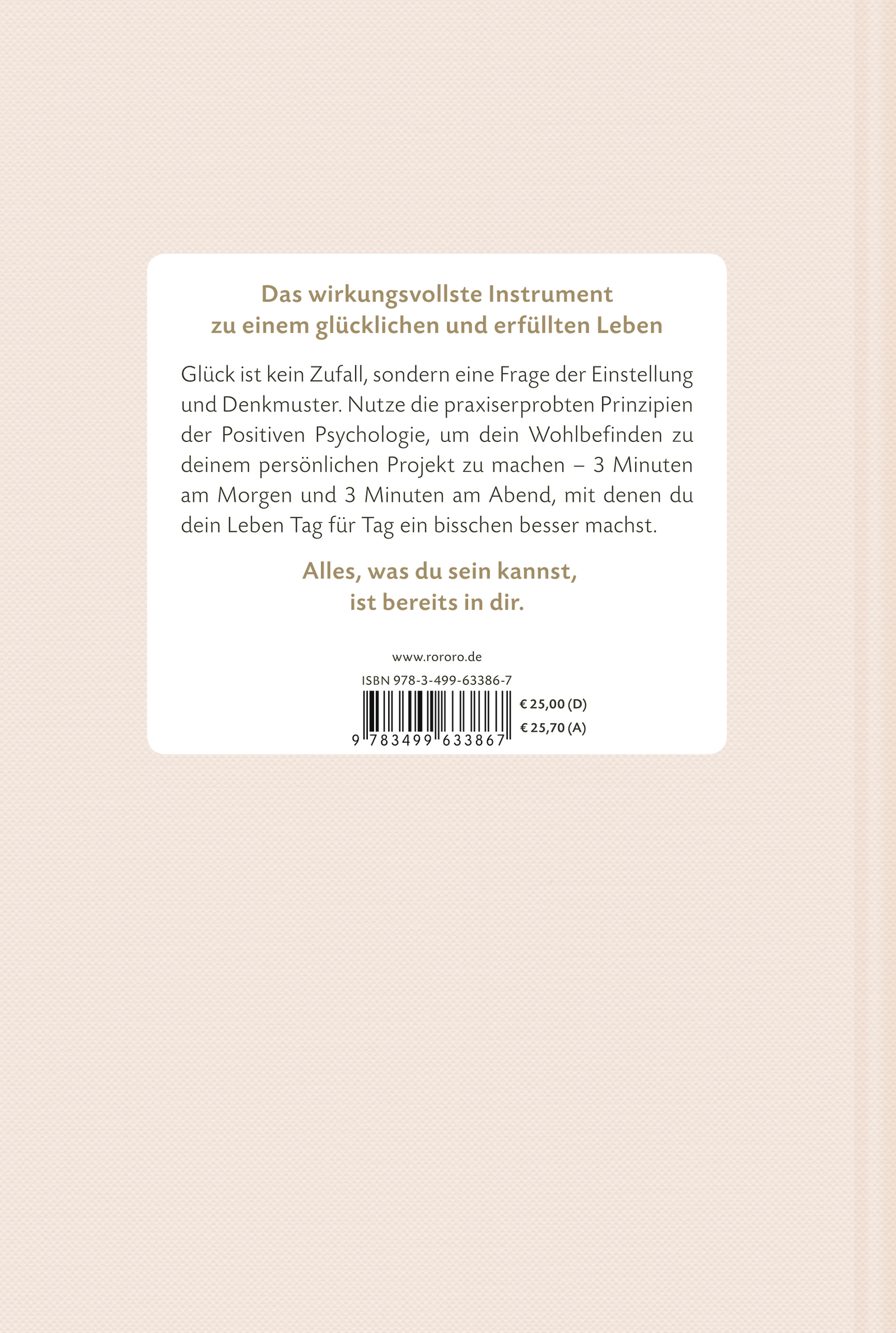 Simpel & wirkungsvoll werden in jeweils drei Minuten am Morgen und am Abend die praxiserprobten Prinzipien der positiven Psychologie genutzt, um das eigene Wohlbefinden langfristig zu steigern. Sechs Minuten, um wünschenswerte Gewohnheiten - wie zum Beispiel Dankbarkeit, Optimismus oder persönliches Wachstum durch tägliche Reflexion - aufzubauen. So werden positive Veränderungen automatisch in den Alltag integriert und du kannst dein Leben Tag für Tag ein bisschen besser machen - konstant & proaktiv.
