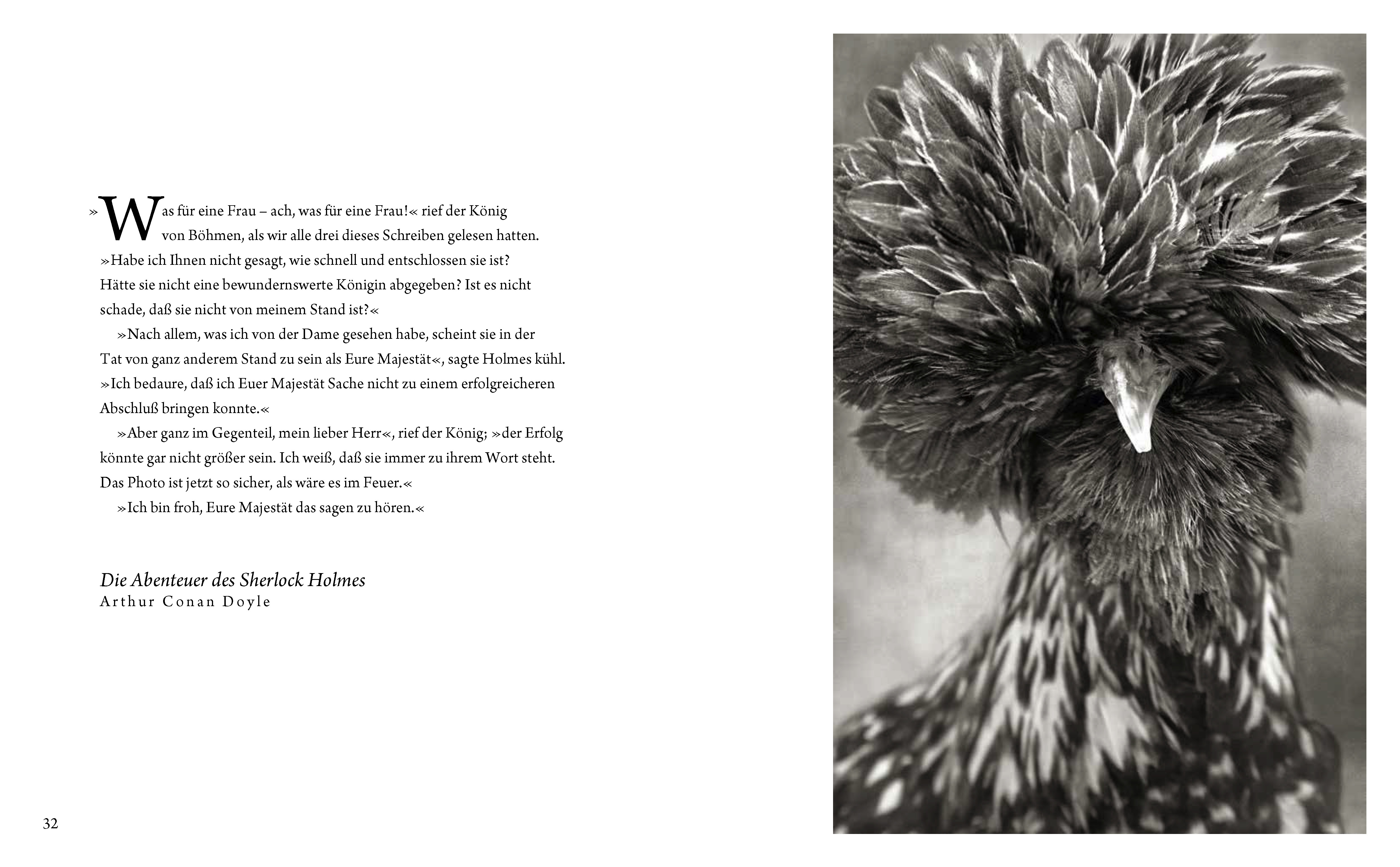 Kann es sein, dass Hühner sehr viel menschlichere Züge haben, als wir bislang dachten? Oder ist es etwa andersherum: Wir gleichen den Hühnern, mehr als wir je vermutet haben? Beth Moon hat über 50 Hühner fotografiert und diese Porträts Texten der Weltliteratur gegenübergestellt. Das Ergebnis ist verblüffend, denn plötzlich sehen wir in dem Gockel, der selbstgefällig seinen Kopf zurückwirft, damit sein Federkranz noch deutlicher sichtbar wird, einen Dandy von Oscar Wilde oder in dem braven, etwas schüchtern anmutenden Huhn eine Figur aus einem Roman von Jane Austen. Anmutig, filigran, zum Teil skurril und verwegen scheinen verschiedenste Charaktere durch Beth Moons Fotografien: Ob Machiavellis Fürst, der Graf von Monte Christo, Dr. Jekyll und Mr. Hyde und viele mehr.
