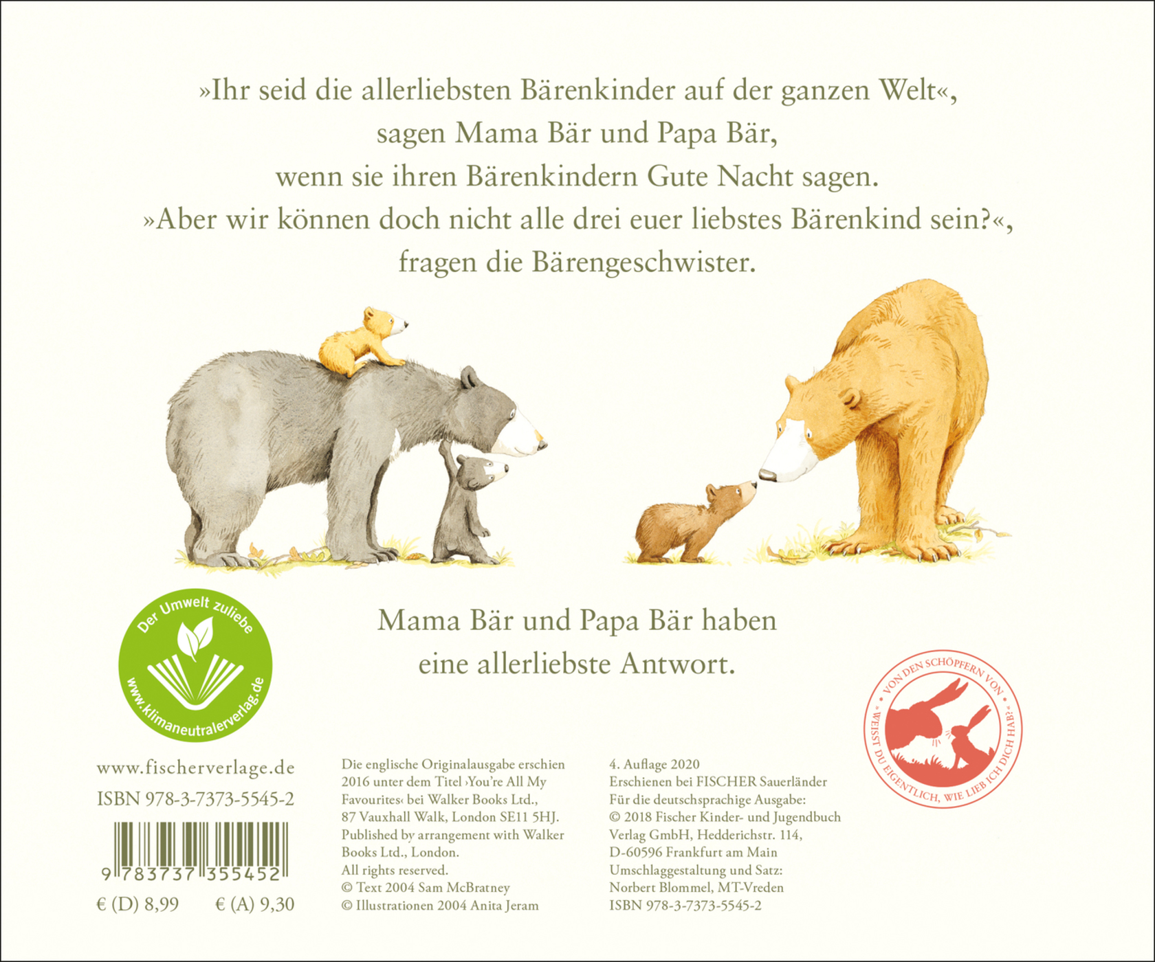 Es waren einmal eine Mama Bär und ein Papa Bär und ihre drei Bärenkinder. Am Abend, wenn die Kinder zu Bett gingen, erzählten ihnen Mama und Papa, dass sie die allerliebsten Bärenkinder von der ganzen Welt wären. Eines Tages aber fragten sich die Geschwister, wen Mama und Papa wohl am allerallerliebsten haben. Es konnten doch nicht alle drei sein - oder? Mama Bär und Papa Bär hatten darauf eine allerliebste Antwort.