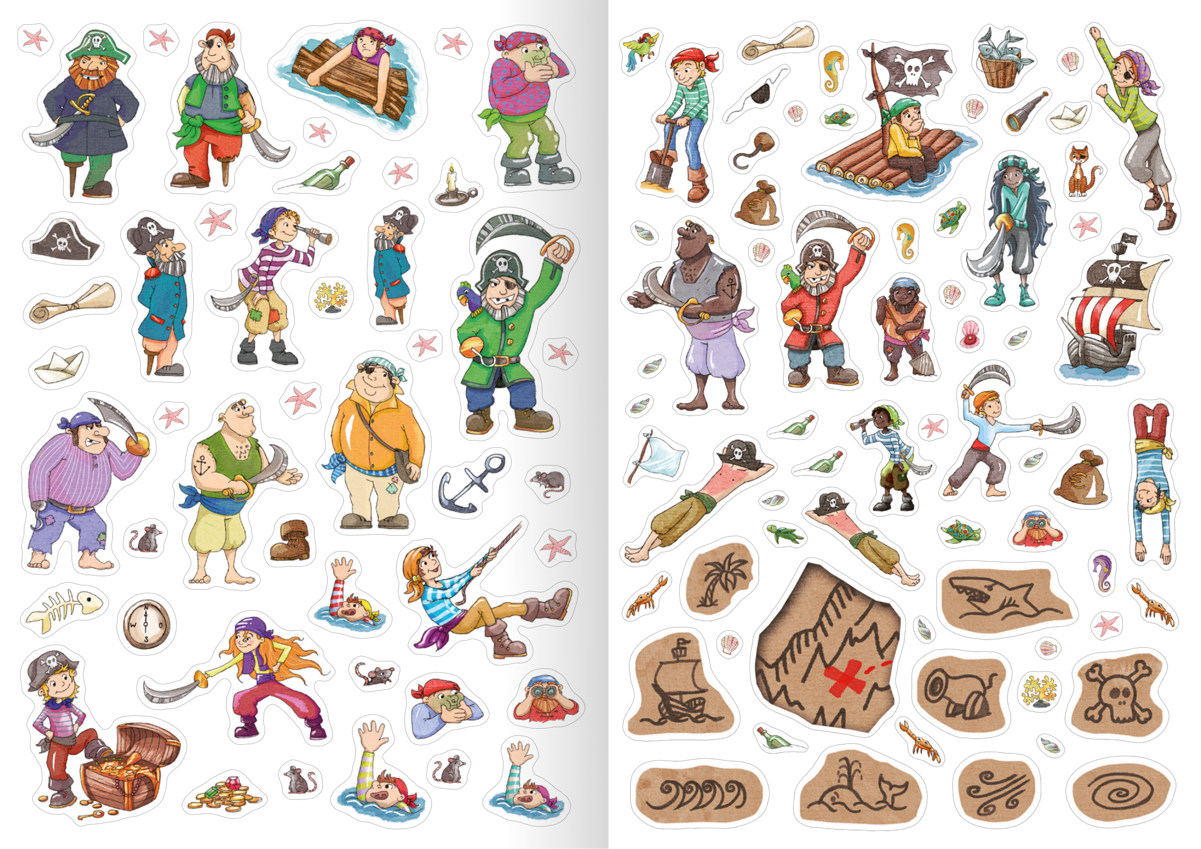 Ob bei einer Seeschlacht, auf einer geheimen Schatzinsel oder im Piratenhafen - in den 13 unterschiedlichen Szenen ist für jeden kleinen Piraten etwas dabei. Hier kann nach Herzenslust geklebt, verziert und das eigene Piratenabenteuer zum Leben erweckt werden.