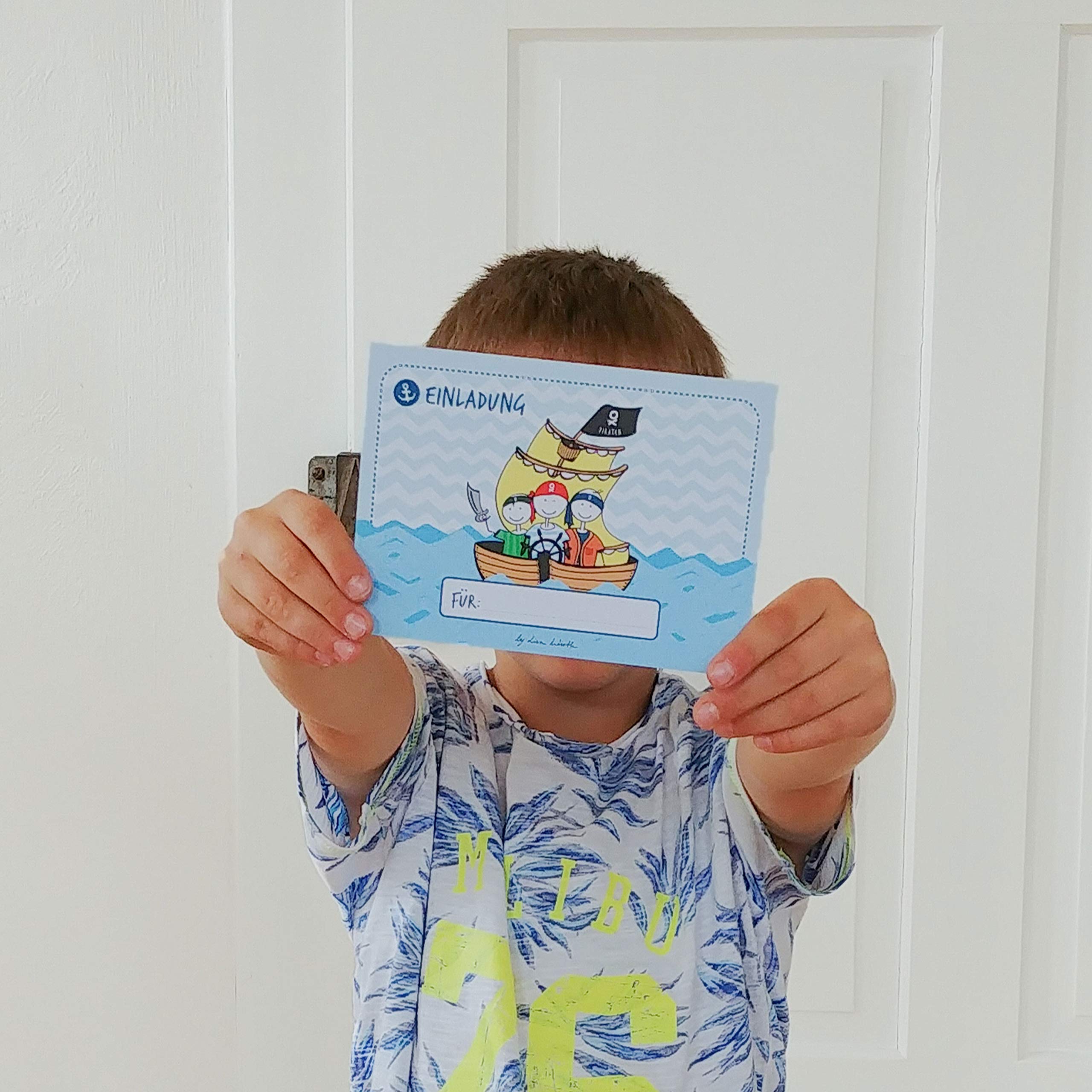 12 Einladungskarten Geburtstag Junge (Piraten). Handgemachte Geburtstag Einladungskarten zum Kindergeburtstag incl. 12 liebevollen Hand designten Briefumschlägen. Verpackt in einer wundervollen hochwertigen Karton Box. By Lisa Wirth