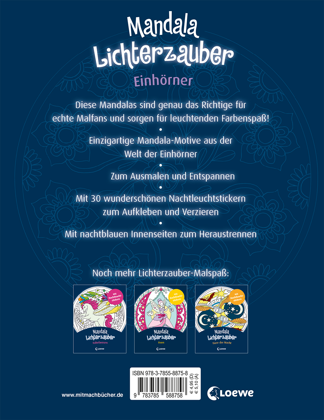 Mandalas verbinden in einzigartiger Weise Kreativität und Entspannung. Die nachtblauen Seiten sorgen dafür, dass die 40 detailreichen Motive zum beliebten Thema Einhörner - wenn einmal ausgemalt - einen geradezu anleuchten. Zu einem echten Lichterzauber-Ergebnis gelangt man, wenn die Seiten zusätzlich mit den beigefügten Nachtleuchtstickern ausgeschmückt werden.