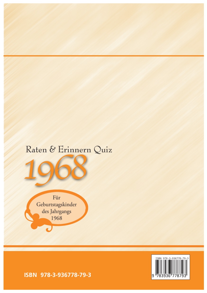 Dieser Quizband wurde speziell für Geburtstagskinder des Jahres 1968 zusammengestellt. Die Fragen im ersten Teil führen zurück in dieses Jahr. Das Jahr, in dem in Vietnam ein blutiger Krieg tobte, gegen den überall auf der Welt demonstriert wurde. In Berlin wurde auf den Studentenführer Rudi Dutschke ein Attentat verübt und in der Tschechoslowakei der „Prager Frühling“ blutig beendet. Die Beatles hatten mit „Hey Jude“ einen großen Erfolg und Freddy Quinn sang „Ich bin ein Vagabund“. Die Olympischen Sommerspiele fanden in diesem Jahr in Mexiko statt und Claudia war der beliebteste Mädchenname. In den Kinos lief der erste Teil der Kinofilmreihe „Plant der Affen“.