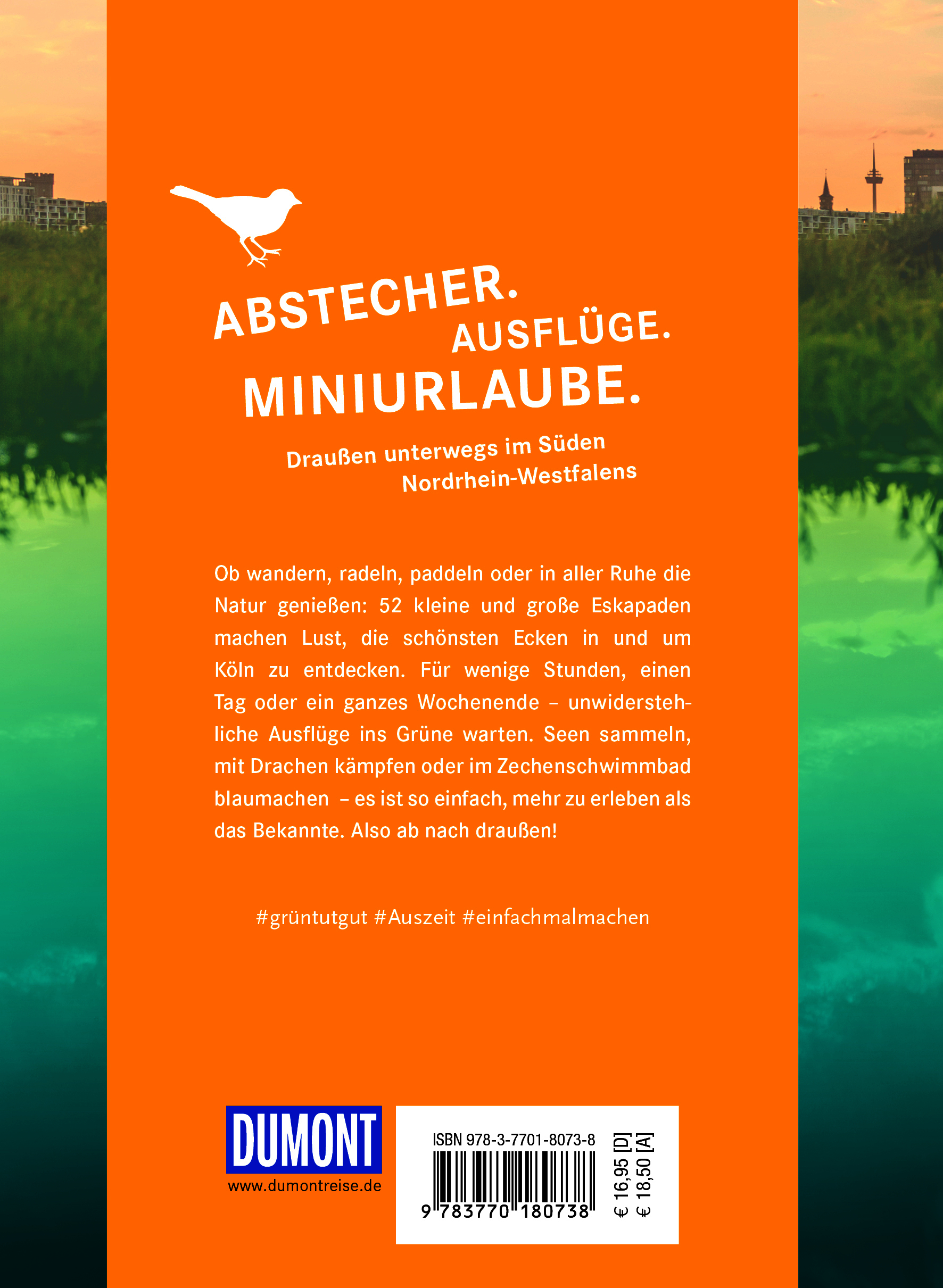Ob wandern, radeln, paddeln oder in aller Ruhe die Natur genießen: 52 kleine und große Eskapaden machen Lust, die schönsten Ecken in und um Köln zu entdecken. Für wenige Stunden, einen Tag oder ein ganzes Wochenende - unwiderstehliche Ausflüge ins Grüne warten. Seen sammeln, mit Drachen kämpfen oder im Zechenschwimmbad blaumachen - es ist so einfach, mehr zu erleben als das Bekannte. Also ab nach draußen!