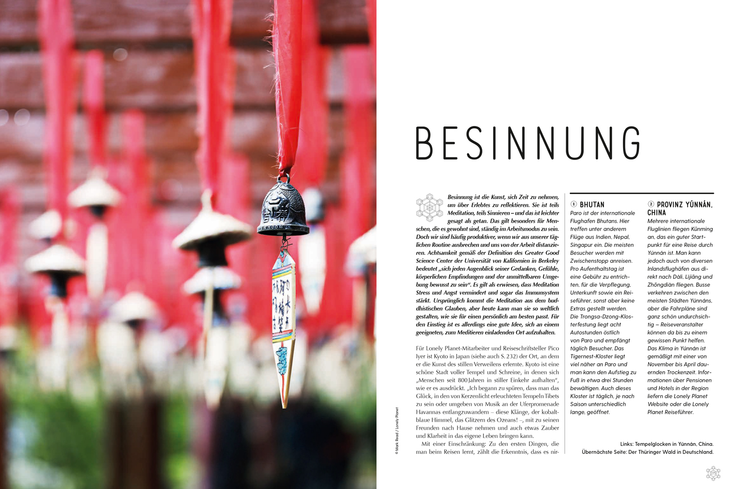 Reisen können inspirieren, uns unseren Lebenszielen wieder näher - bringen. Die Welt ist voller Orte, die uns auf unterschiedliche Art berühren und verändern, die uns Kraft schenken oder uns demütig machen - seien es die meterhohen Wellen, die donnernd an Hawaiis Sandstrände rollen, die Stille in einem buddhistischen Kloster oder das Gefühl grenzenloser Freiheit unterm Sternenhimmel von Namibia - für jeden Reisenden gibt es das perfekte Ziel für seine Auszeit.