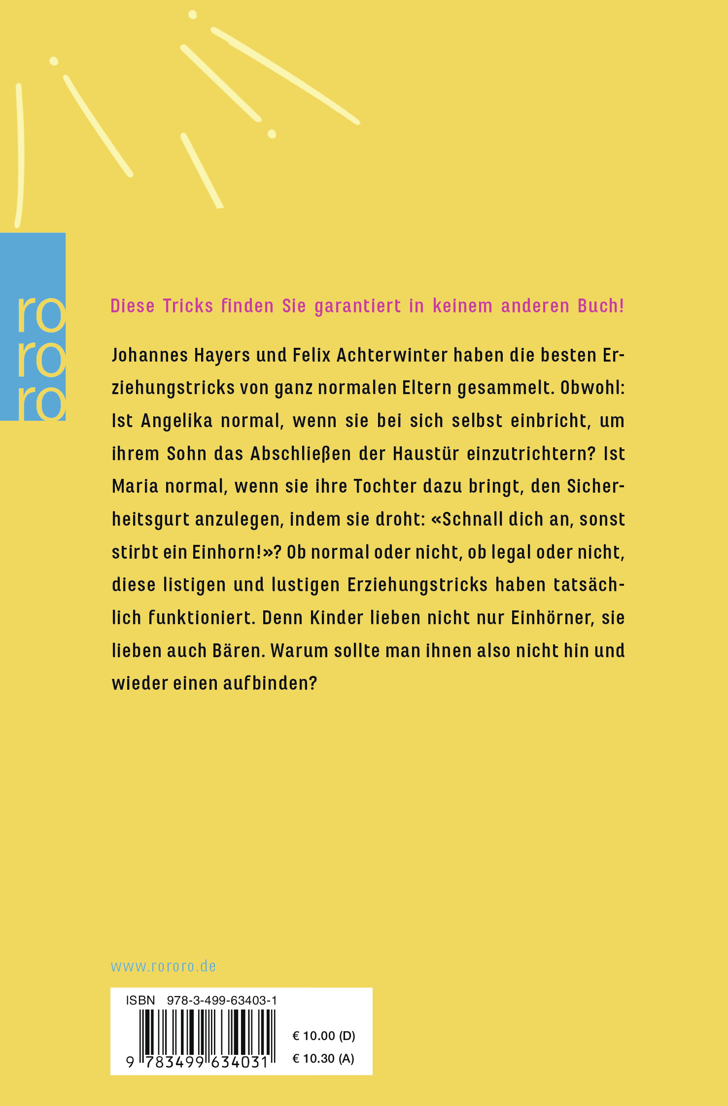 Johannes Hayers und Felix Achterwinter haben die besten Erziehungstricks von ganz normalen Eltern gesammelt. Obwohl: Ist Angelika normal, wenn sie bei sich selbst einbricht, um ihrem Sohn das Abschließen der Haustür einzutrichtern? Ist Maria normal, wenn sie ihre Tochter dazu bringt, den Sicherheitsgurt anzulegen, indem sie droht: «Schnall dich an, sonst stirbt ein Einhorn!»? Ob normal oder nicht, ob legal oder nicht, diese listigen und lustigen Erziehungstricks haben tatsächlich funktioniert. Denn Kinder lieben nicht nur Einhörner, sie lieben auch Bären. Warum sollte man ihnen also nicht hin und wieder einen aufbinden?