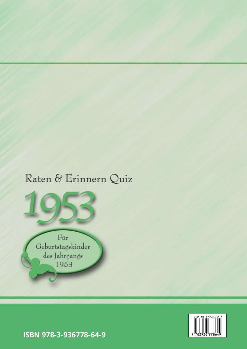 Nicht nur wer 1953 geboren wurde, wird viel Spaß und Freude mit diesem Quizband haben. Die Fragen und Antworten regen zum Nachdenken und zum Erinnern an und laden so zu einer Zeitreise für das Gedächtnis ein.