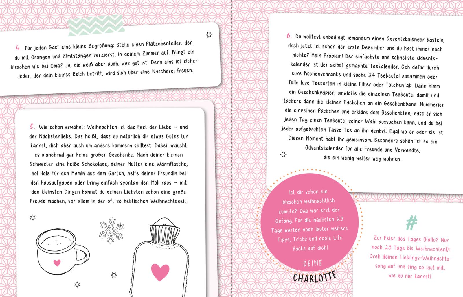 In diesem Adventskalender wartet jeden Tag eine neue Überraschung! Ob tolle DIY-Anleitungen für wunderschöne weihnachtliche Deko, die leckersten Rezepte oder exklusive Tipps und Tricks von Charlotte für Zwei- und Vierbeiner – auf den liebevoll gestalteten Seiten findet sich alles, was die Adventszeit zu einem vollen Erfolg werden lässt.