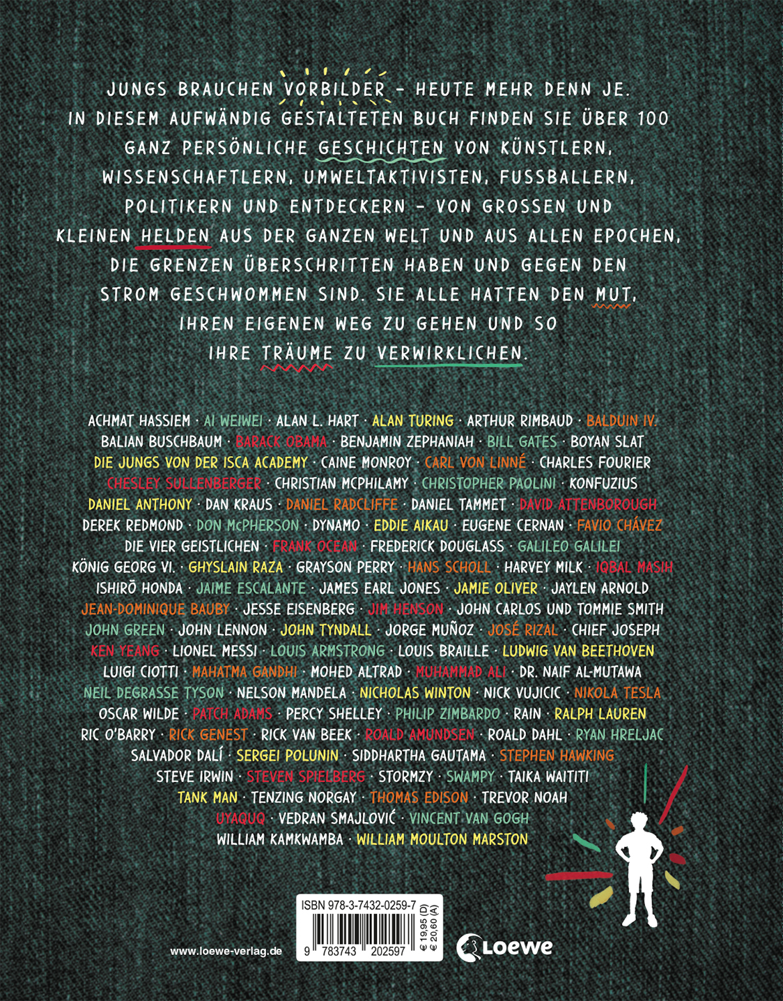 Jungs brauchen Vorbilder – heute mehr denn je. In diesem aufwändig gestalteten Buch finden sie über 100 ganz persönliche Geschichten von Künstlern, Wissenschaftlern, Umweltaktivisten, Fußballern, Politikern und Entdeckern – von großen und kleinen Helden aus der ganzen Welt und aus allen Epochen, die Grenzen überschritten haben und gegen den Strom geschwommen sind. Sie alle hatten den Mut, ihren eigenen Weg zu gehen und so ihre Träume zu verwirklichen.