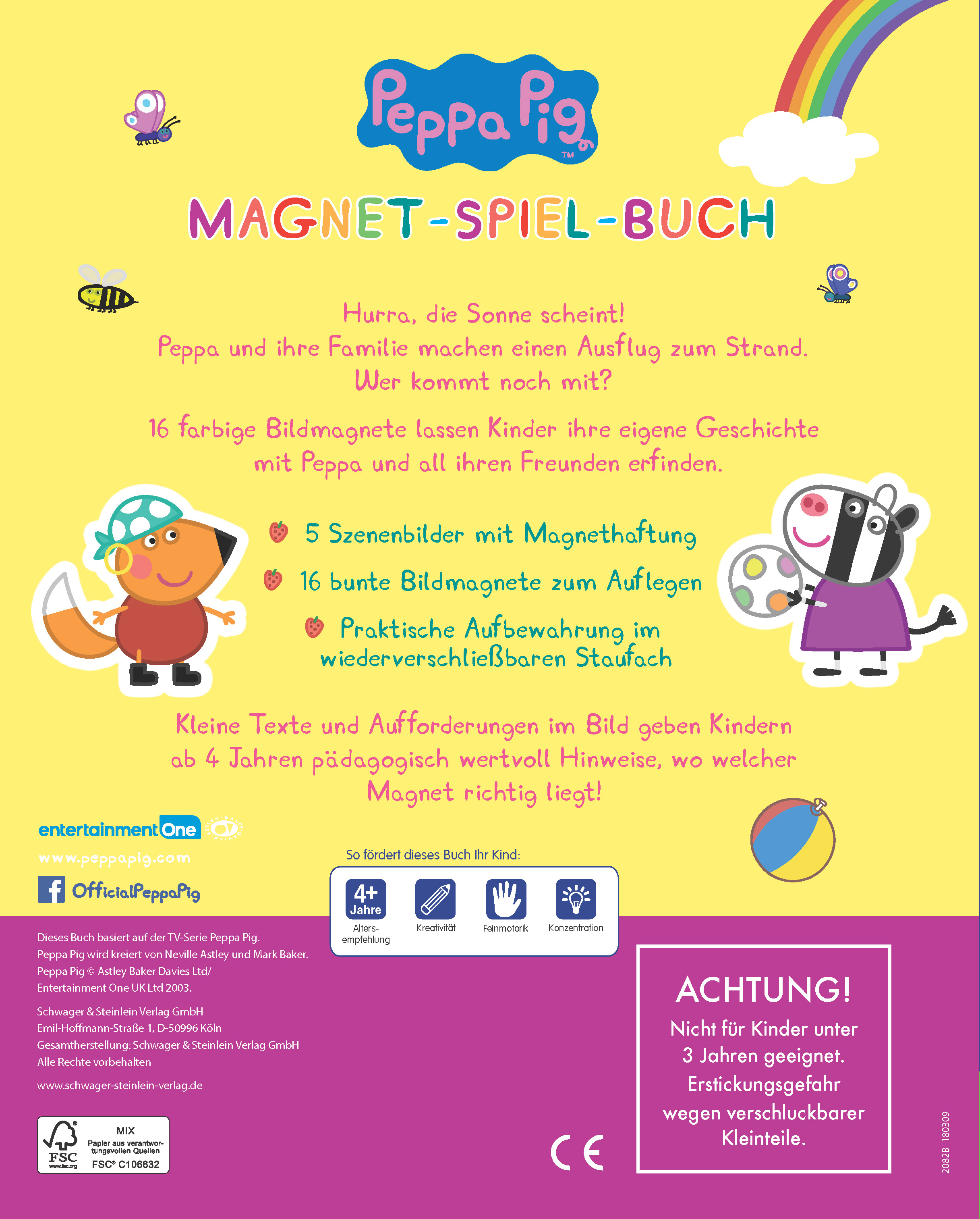 Mit Peppa und ihren Freunden hat man immer ganz viel Spaß! Lerne alle Figuren kennen, begleite sie auf den Spielplatz oder sei dabei, wenn Familie Wutz an den Strand fährt. Mit den 16 kunterbunten Magneten kannst du dir eigene Geschichten ausdenken und die Szenen beliebig erweitern. Die abwechslungsreichen Seiten bieten jede Menge Platz für das Einsetzen der Magnete. Mit wem spielt Peppa in ihrem Kinderzimmer? Wer fährt mit dem Fahrrad zum Spielplatz? Und welches Musikinstrument spielt der kleine Schorsch? Kleine Hinweise verraten, in welchen Hintergrund die Figuren am besten passen und laden zum weiteren Erzählen und Betrachten ein. Durch das Einsetzen und Spielen mit den Magneten werden Feinmotorik und Kreativität gefördert. Das wiederverschließbare Staufach, das im Cover integriert ist, erlaubt es, die Magnete nach dem Nutzen ganz einfach wieder zu verstauen. Ein perfektes Vorlese- und Mitmachbuch für alle Peppa-Fans!