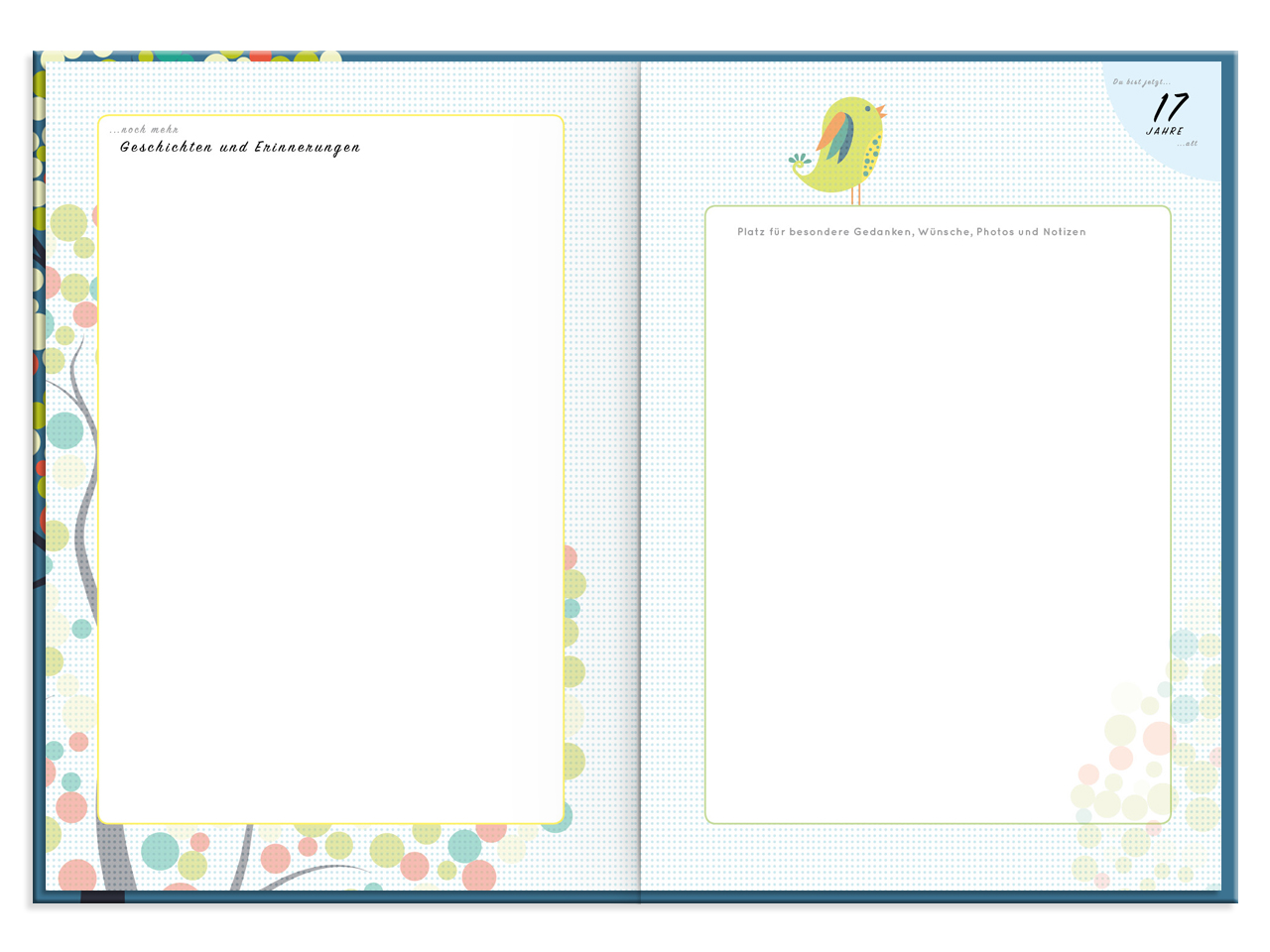 Ein wundervolles Erinnerungsalbum, bei dem Eltern und Familie über 18 Jahre alle Momente und Erlebnisse des eigenen Kinds auf besondere Art und Weise festhalten können. Mit der Geburt beginnend enthält dieses einzigartige Album für jedes Jahr liebevoll gestaltete Seiten zum Eintragen, Einkleben und Selbstgestalten. Damit das Album auch lange Freude bereitet, sind die Seiten besonders stabil und der Einband des Buches fest und folienkaschiert. Und für das gewisse Etwas gibt es eine wunderschöne Goldfolienprägung auf dem Cover des Buches, so kann jeder erkennen dass es sich um ein einzigartiges, persönliches Erinnerungsstück handelt. Einmal ausgefüllt ist dieses Erinnerungsbuch ein für immer verbindendes Band zwischen Eltern und Kind.