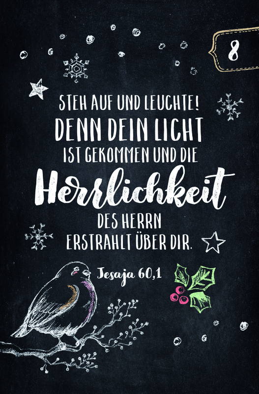| Schlagworte | Adventskalender • Bibelverse • Clipboard • handlettering • Klemmbrett • Kreide-Stil • Postkartenkalender • Postkarten Weihnachten • Tischaufstellkalender • Weihnachtskarte • Zitate |