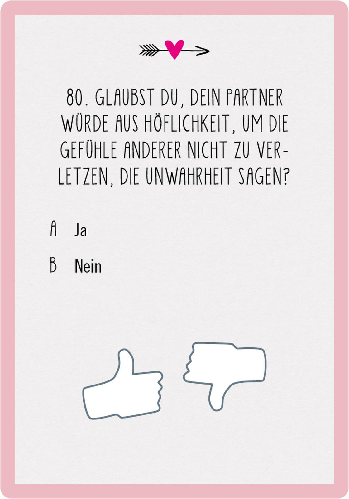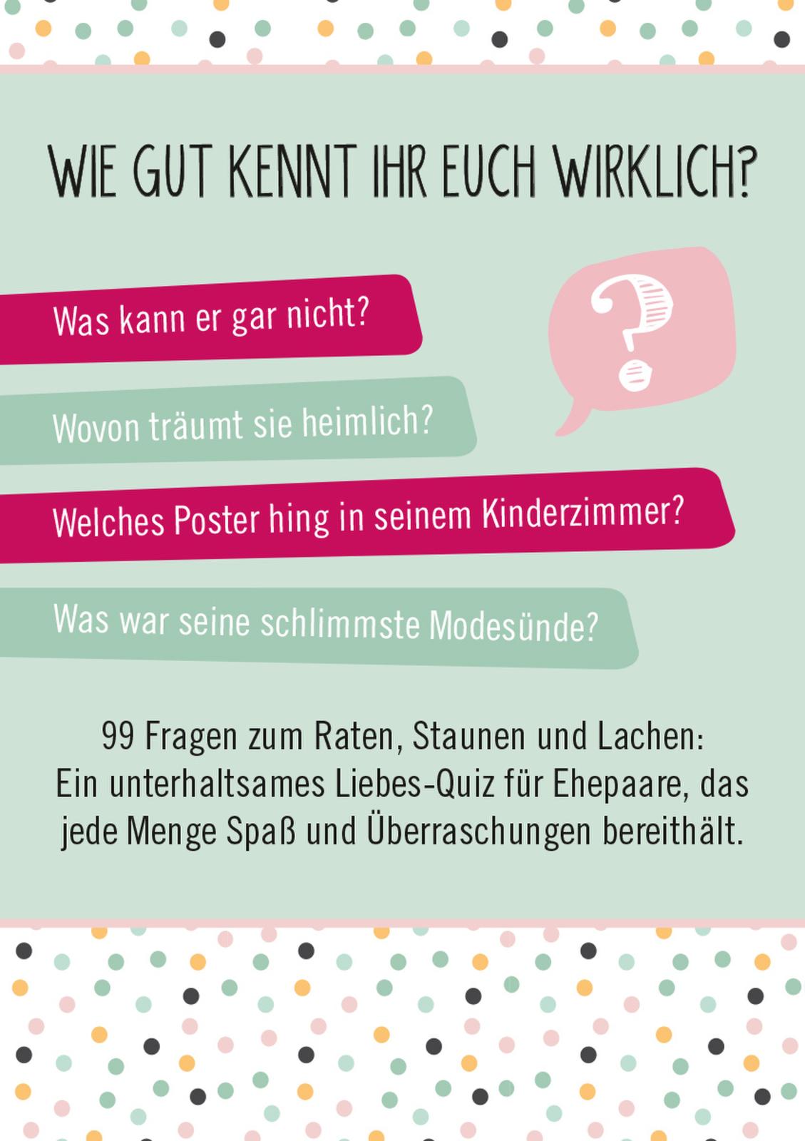 Diese Quizkarten laden zum Raten, Staunen und Lachen ein: Was kann er gar nicht? Wovon träumt sie heimlich? Womit hat er als Kind gespielt? Und was war die schlimmste Modesünde, die sie je begangen hat? Als unterhaltsamer Zeitvertreib zu zweit, im Urlaub oder einfach so zwischendurch - dieses Kartenspiel hält garantiert jede Menge Überraschungen bereit!