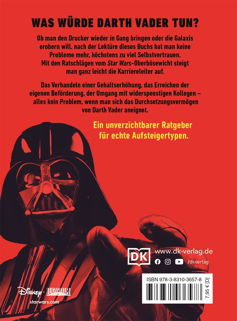 Durch die lustigen Karrieretipps vom Star Wars Bösewicht Darth Vader steigt jeder leicht auf vom Praktikantenposten bis zum Chefsessel. Ob das unauffällige Wegräumen von Konkurrenten oder das Nutznießen von der Arbeit der Kollegen: Dank Einstellung und Durchsetzungsvermögen von Darth Vader ist das alles easy zu meistern. Die, nicht immer ganz ernst zu nehmenden, Ratschläge vermitteln die richtige, skrupellose Einstellung für eine erfolgreiche Karriere. Jeder Ratschlag wird von einem passenden Star Wars Zitat begleitet und enthält viele unterhaltsame Anspielungen auf die Star Wars Filme.