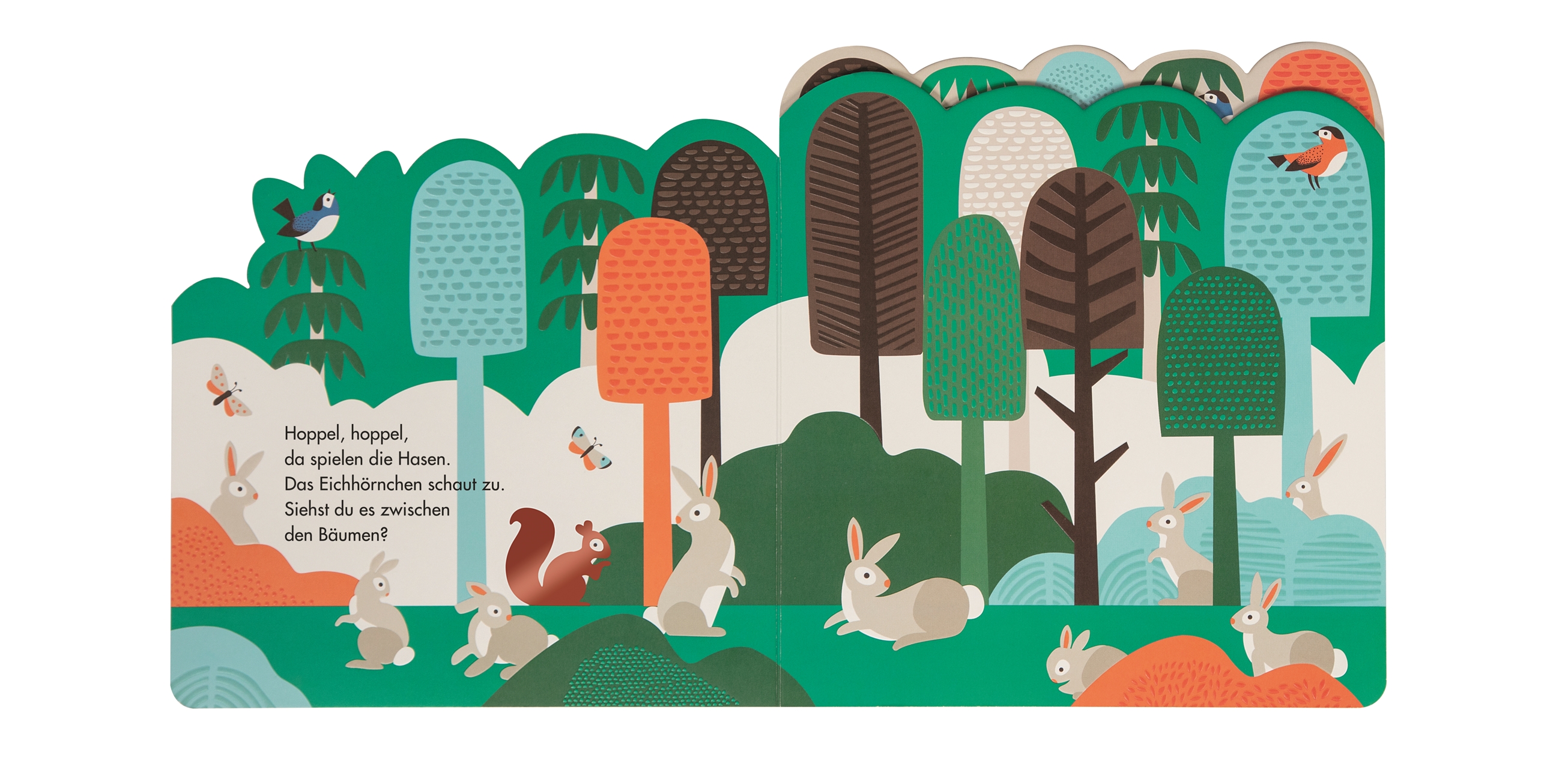 Mit dem originellen, hochwertigen Pappbilderbuch wandern Kinder auf noch nie da gewesene Art im Reich der Waldtiere umher. Die verschieden großen Seiten in Baumkronenform sind übereinander gestaffelt angeordnet und lassen sich nach und nach aufblättern. Individuelle Glanz- und Strukturelemente sowie poetisch gereimte Texte machen die Seiten mit Panorama-Stanzung zu etwas ganz Besonderem. Mit witzigem Guckloch im Cover!