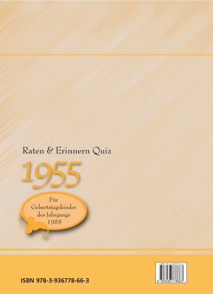 Dieser Quizband führt uns zunächst zurück ins Jahr 1955, das Jahr in dem die BRD in die Nato und die DDR in den Warschauer Pakt eintraten und 10.000 deutsche Kriegsgefangene als Spätheimkehrer aus Russland zurückkamen. In Wolfsburg wurde der einmillionste VW-Käfer gebaut. Der Bundeskanzler hieß Konrad Adenauer, im Fernsehen lief erstmals die beliebte Ratesendung „Was bin ich?“ und im Kino kam Curd Jürgens im Film „Des Teufels General“ auf die Leinwand. Im zweiten Teil dieses Quizbandes wird nach berühmten Personen, die 1955 geboren wurden, gefragt. Dazu gehören u.a. bekannte deutsche Musikstars wie Nina Hagen, Marianne Rosenberg oder Helge Schneider. Der ehemalige französische Präsident Nicolas Sarkozy und der Fußballer Karl-Heinz Rummenigge gehören ebenfalls zu den Geburtstagskindern des Jahres 1955 wie die IT-Pioniere Steve Jobs und Bill Gates. „Wie die Zeit vergeht!“ Unter diesem Motto geht es dann weiter mit einer Zeitreise in Fünfjahresschritten, indem wir fragen: Was passierte eigentlich „1960, als ich 5 Jahre alt war“ oder „1965, als ich 10 Jahre alt war“, bis in die jüngste Vergangenheit, dem Jahr „2015, als ich 60 Jahre alt war“?