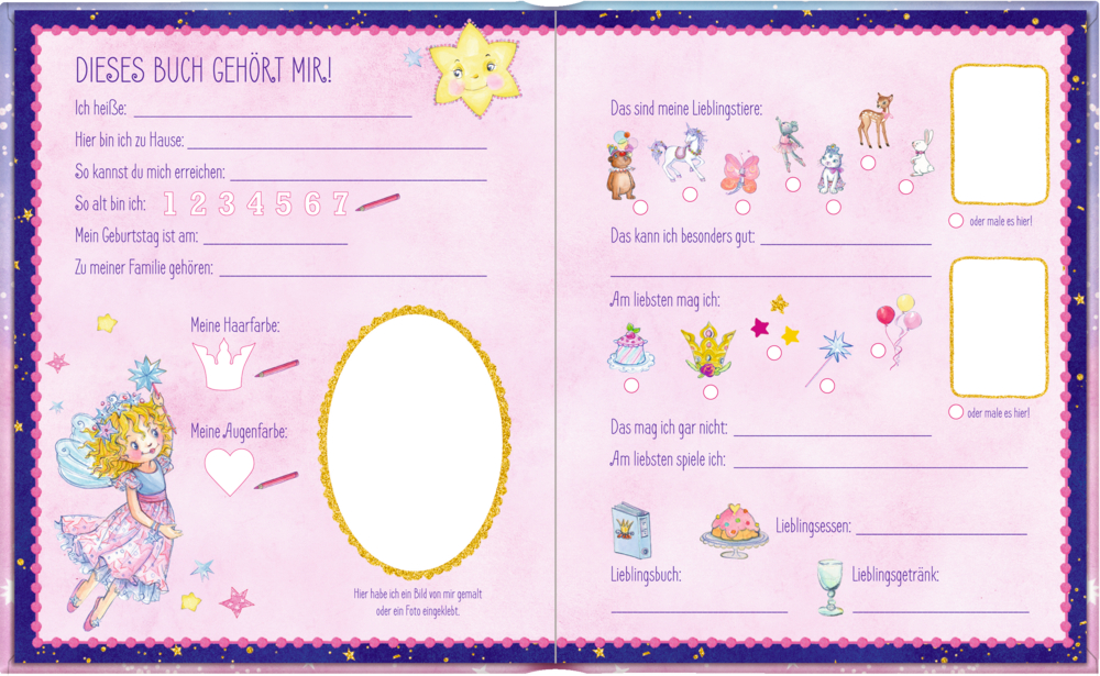In dieses zauberhafte Buch können kleine Prinzessinnen und ihre Freundinnen und Freunde hineinschreiben. Die 96 liebevoll gestalteten Seiten bieten viel Platz zum Malen, Ankreuzen und Einkleben - für jedes Kind gibt es vier Seiten. Zusätzlich enthält es Eintragseiten für drei Erzieher und alle wichtigen Geburtstage.