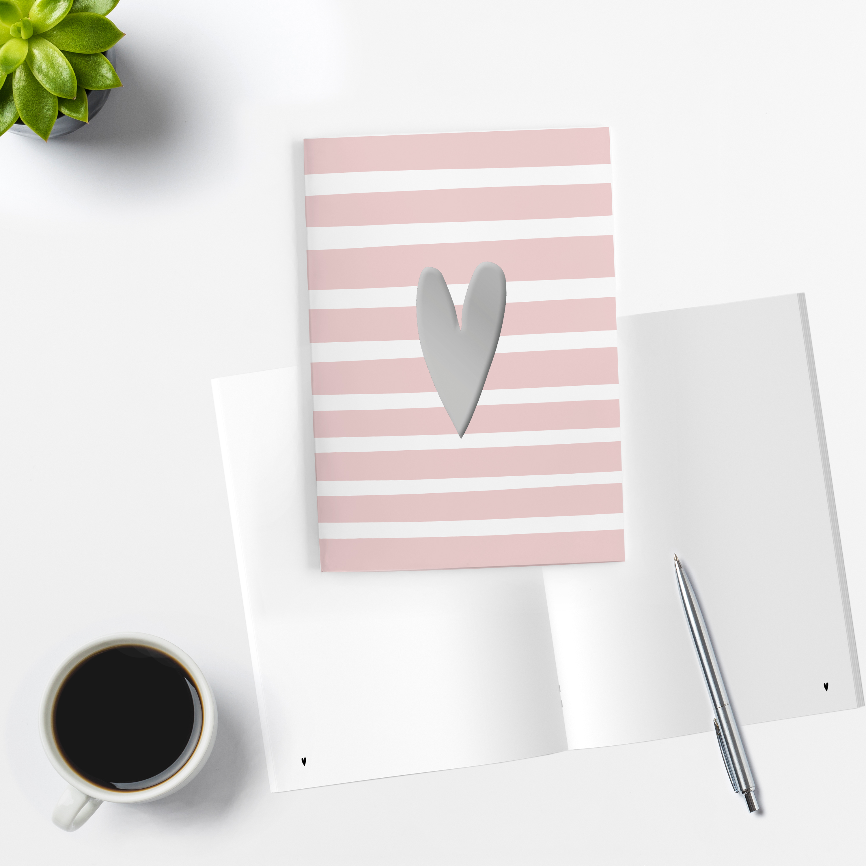 4er Set Notizheft DIN A5 (blanko) in rosa mit 2 verschiedenen Herz-Motiven und jeweils 40 Seiten in weiß mit 120 g Papier. Vorderseite mit hochwertiger Silberfolien-Veredelung.
