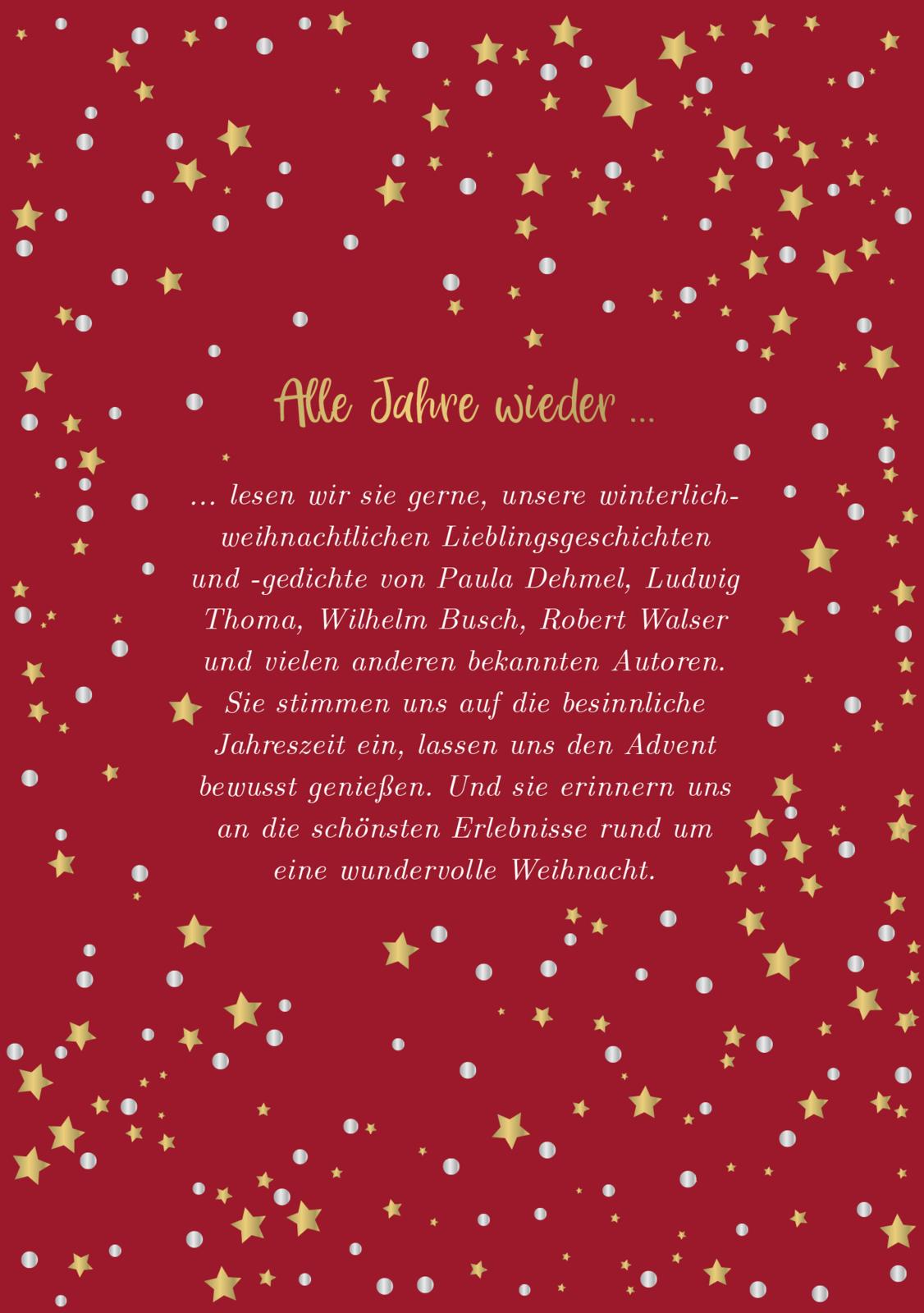 Weihnachten kommt immer so plötzlich? Und der Advent ist weniger besinnlich, sondern eher stressig mit all den Dingen, die noch vor dem großen Fest erledigt werden wollen? Gönnen Sie mit diesem Buch sich und Ihrer Familie, Ihren Freunden und lieben Menschen aus Ihrer Umgebung eine kleine weihnachtliche Auszeit. Gemütliches Kerzenlicht, ein selbst geschmückter, nach Tanne duftender Adventskranz und eine Tasse Tee mit Plätzchen lassen den Alltag vergessen. Die Geschichten aus diesem Buch versetzen Leser und Zuhörer in die beste Weihnachtsstimmung und wecken glückliche Erinnerungen an die Kindheit. Genießen Sie die stille Jahreszeit, die Vorfreude und den Spaß am Lesen und Vorlesen.
