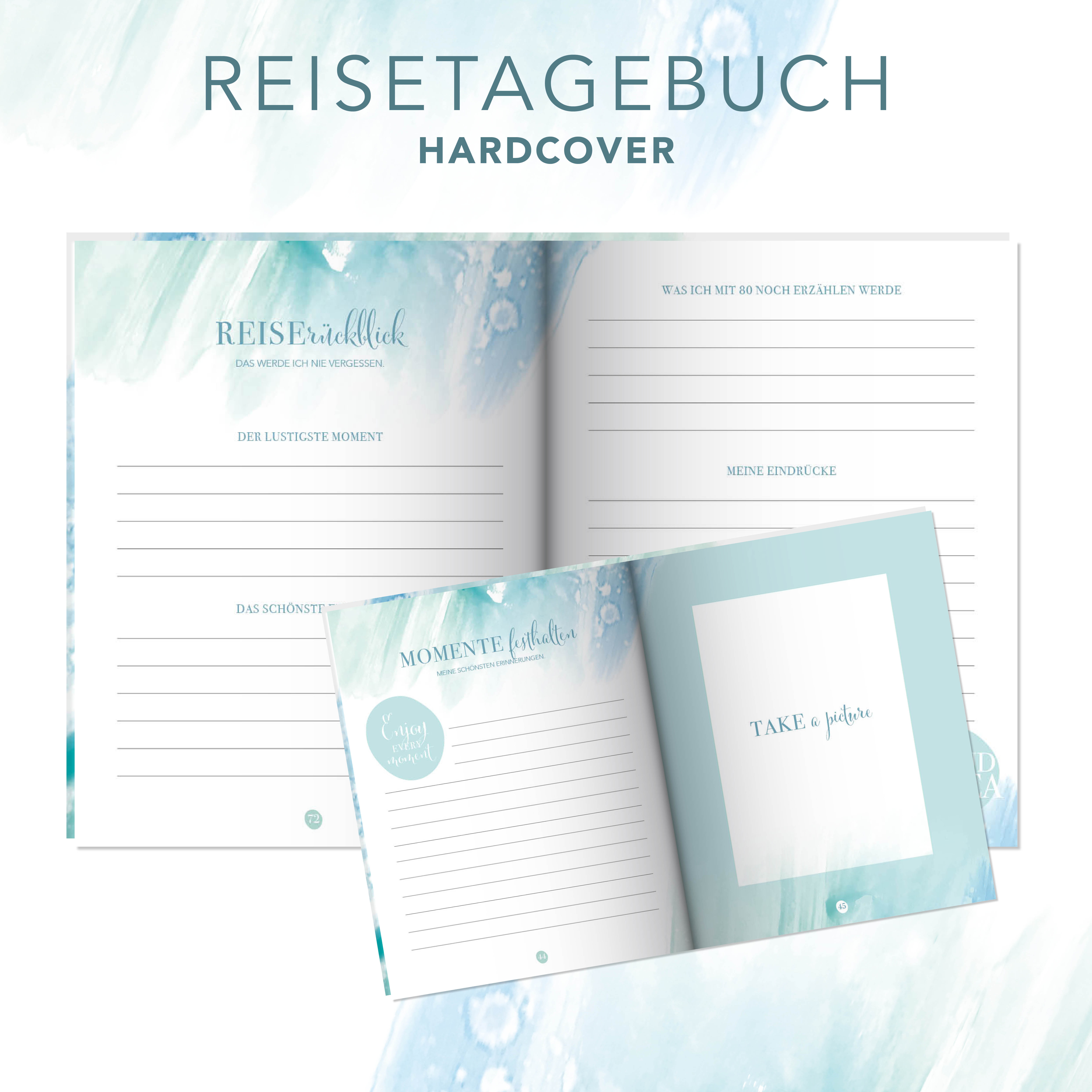 Hardcover Urlaubstagebuch mit inspirierenden Zitaten zum Ausfüllen für bis zu 3 Wochen, inkl. Reisetipps.