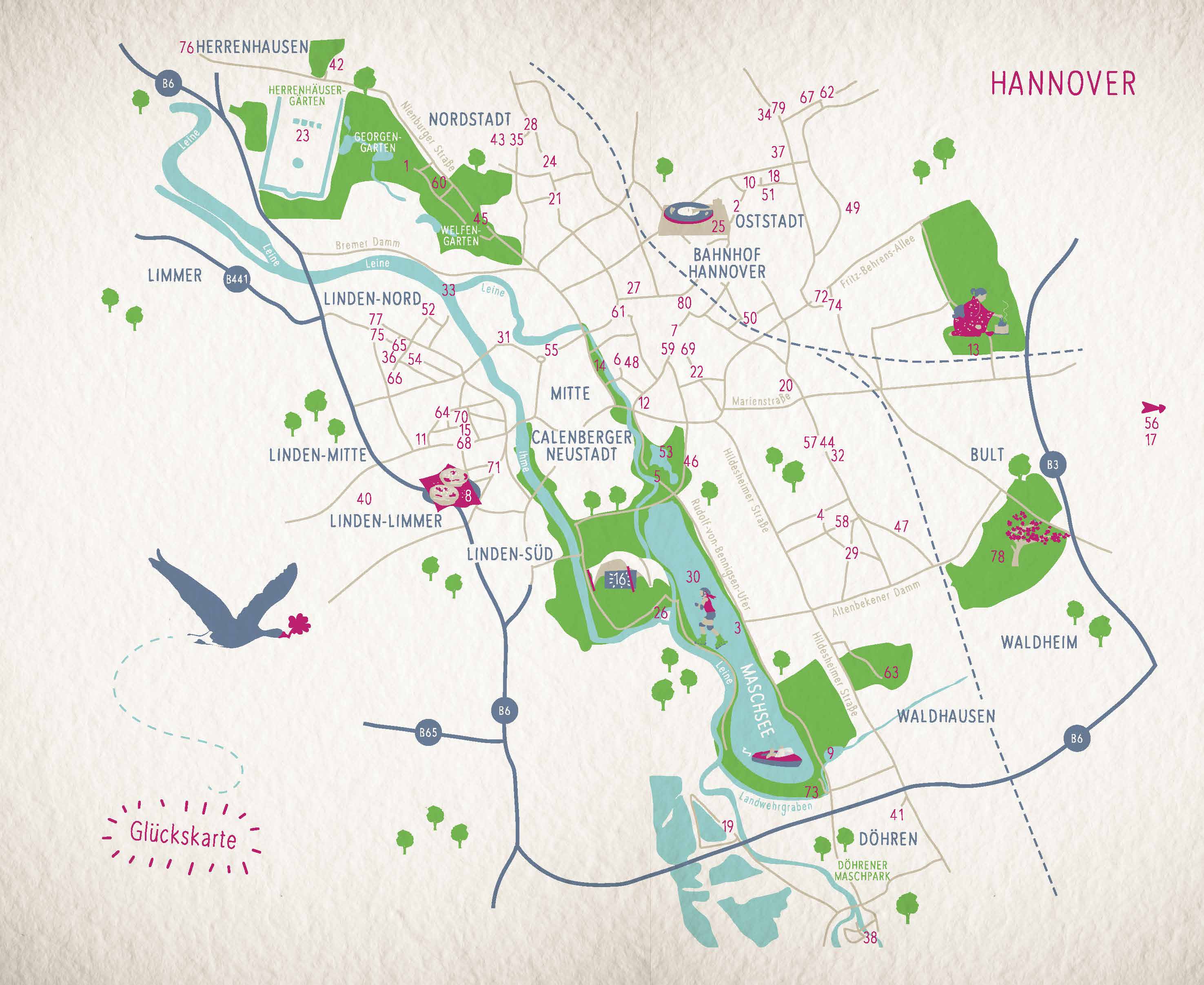 Hannovers Glücksrezept? Die Mischung macht's! Natur trifft Stadt, Trubel trifft Ruhe - und mittendrin viele Orte mit Wohlfühlgarantie: Der riesige Stadtwald Eilenriede erdet mit seinem herrlichen Duft nach Natur, der funkelnde Maschsee wird zur maritimen Oase. In charmanten Cafés wird Kaffeetanten und Kuchenfreunden ein süßes Stück vom Glück serviert - auf Wunsch mit Sahnehäubchen. Und die schnuckeligen Boutiquen im Stadtteil List garantieren Shoppingfreuden und beweisen, dass das Glück entgegen aller Behauptungen manchmal käuflich ist.