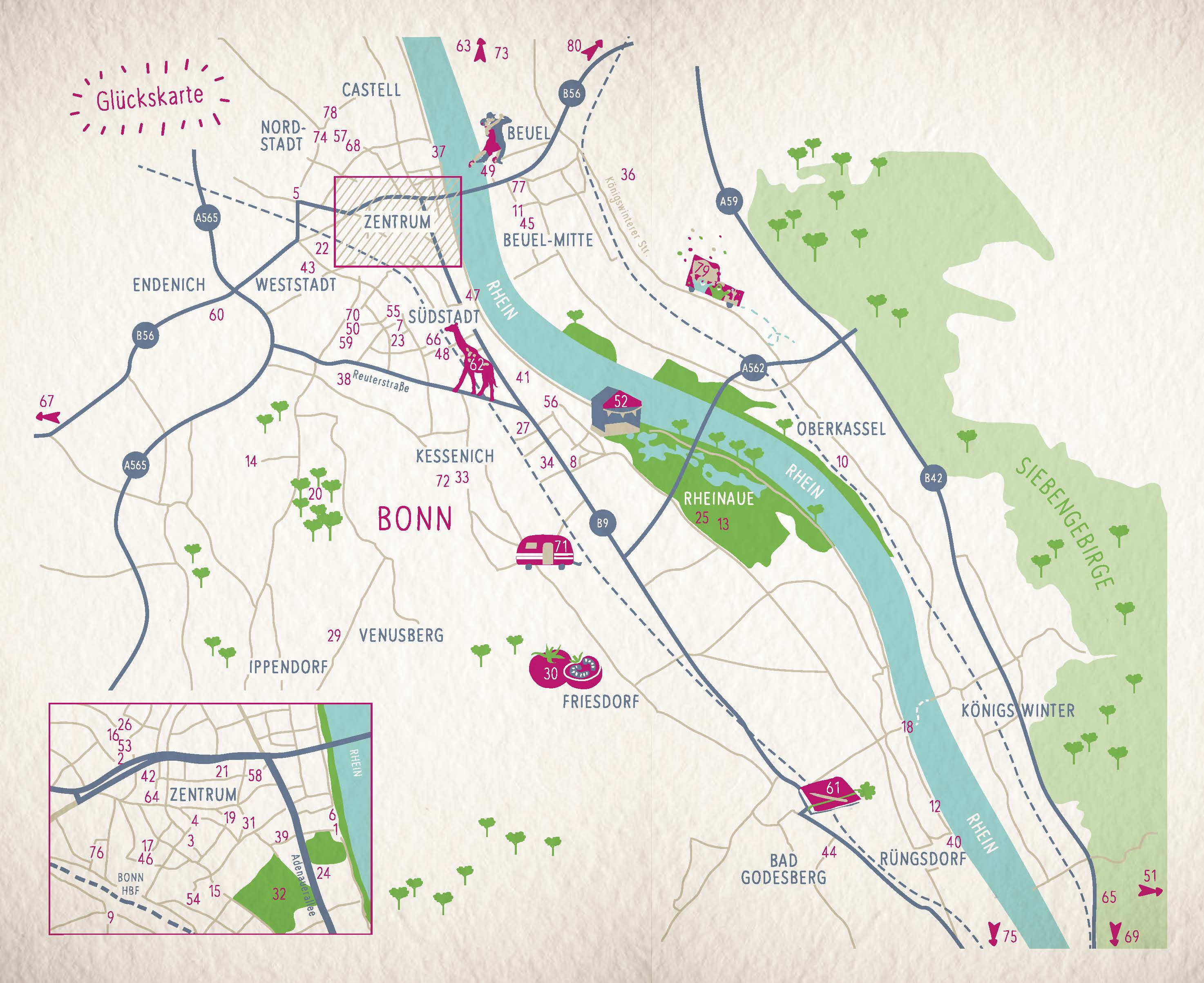 Bonn ist ein Verwandlungswunder: Hauptstadt, Bundesstadt, UN-Stadt, Studentenstadt - und sie steckt voller Glücksorte. 80 davon hat Ursula Kollritsch gefunden. Hier kann man der Kunst aufs Dach steigen, übers Wasser schweben, in einer Telefonzelle lesen, mit der Wäscheprinzessin Karneval feiern oder im Knusperhäuschen einfach mal abwarten und Tee trinken. Und wer Beethovens Geburtshaus besucht und seine berauschende Musik im Ohr hat, schwebt auf den Klängen des Glücks.
