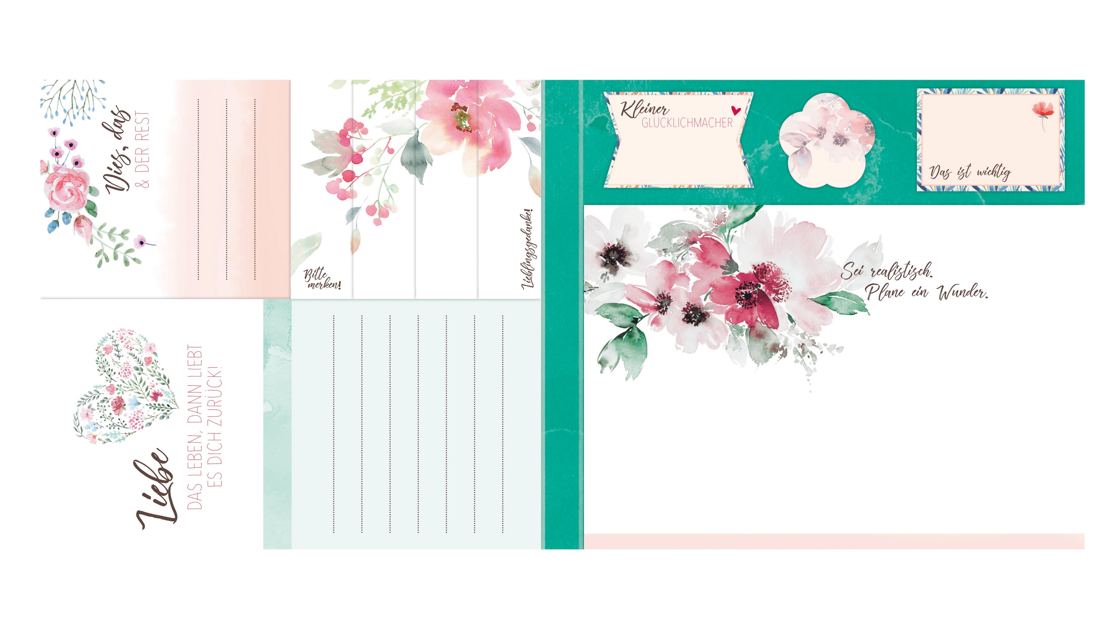 So geht kein Gedanke verloren. Die über 350 Zettelchen in verschiedenen Größen können nach Herzenslust beschrieben und geklebt werden. Schnelle Notizen, kleine Botschaften und spontane Ideen – hier ist Platz für alles Wichtige und Schöne. Und auf dem großen Schreibblock ist Platz für Einkaufsliste, To-dos, Ziele und mehr.
