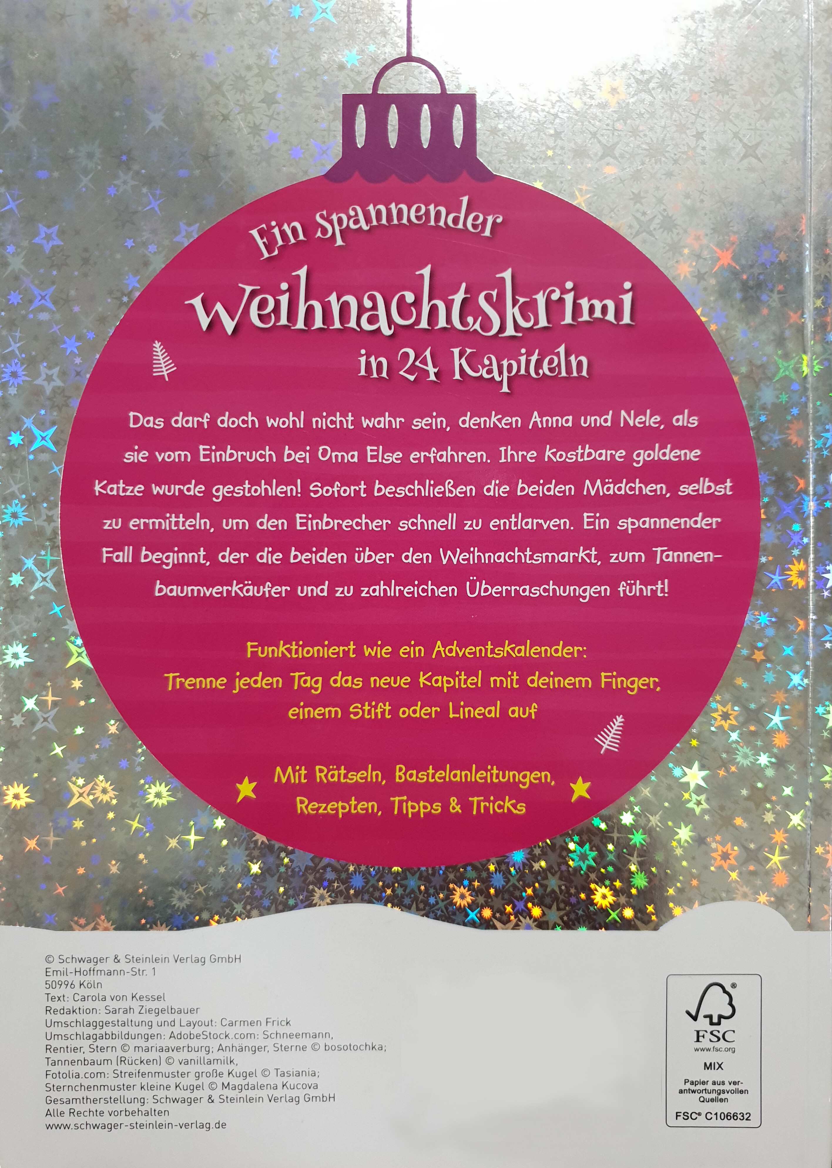 | Schlagworte | 24 Geschichten • Abenteuer • Abenteuergeschichten • Abenteuerlust • Abenteurer • Advent • Adventsbuch • Adventskalender • Bilderbücher • Detektiv • Detektive • Detektivin • Detektivinnen • Geheimnis • Geschenk • Geschichte • Hologrammfolie • Jugendbücher • Kalender • Kinder • Kinderbuch • Krimi • Lösungswort • Mädchen • Nikolausgeschenk • Rätsel • Roman • Türchen • Weihnachten • Weihnachtsbuch • Weihnachtsmann |