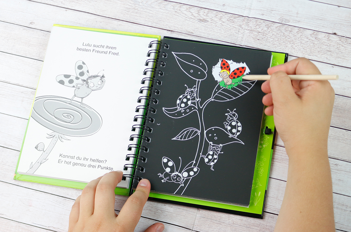 Hilfst du dem kleinen Tintenfisch, der nicht mehr in sein Haus hineinpasst? Mit nur wenigen Strichen kannst du ihm ein neues Zuhause kratzeln! Doch nicht nur das - du kannst auch herausfinden, als was sich Ella, das Fohlen, für das Kostümfest verkleidet hat und wer beim Wettfliegen gewinnt. Schnapp' dir den Holzstift und kratzle los!