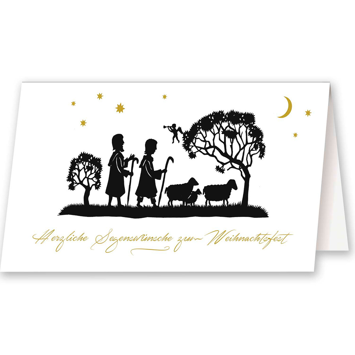 Die fünf Karten zeigen verschiedene kunstvoll gestaltete Scherenschnittmotive. Die feine goldgeprägte Schrift verleiht den liebevollen Segenswünschen zum Weihnachtsfest besonderen Glanz. (5er-Set, je 12 × 17 cm, Goldprägung, mit passenden Umschlägen)