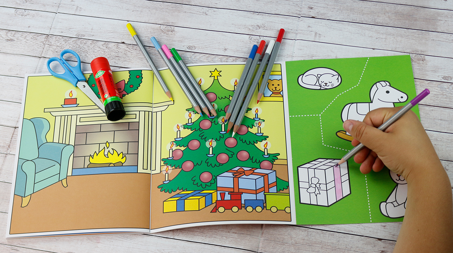 Die perfekte Beschäftigung in der Weihnachtszeit! Zuerst wird die perforierte Ausklappseite abgetrennt und dann werden die weihnachtlichen Motive ausgemalt. Danach dürfen kleine Bastler die Motive entlang der extradicken Umrisslinien ausschneiden und in die weihnachtlichen Szenen einkleben. So macht Basteln Spaß!