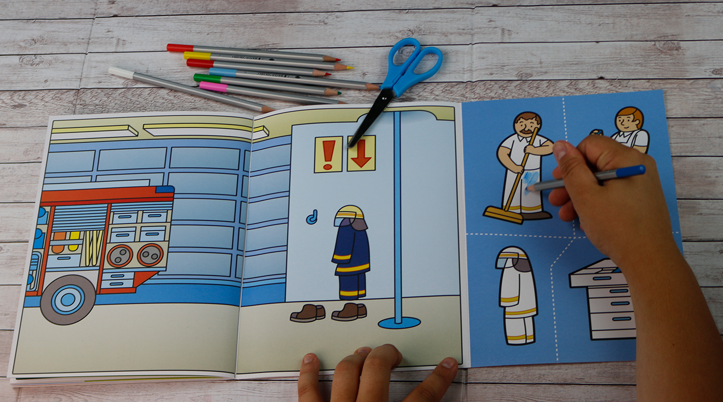 Ab jetzt ist Basteln kinderleicht! Zuerst wird die perforierte Ausklappseite abgetrennt und dann werden die Motive ausgemalt. Danach dürfen kleine Bastler die Motive entlang der extradicken Umrisslinien ausschneiden und in die Feuerwehrszene einkleben. Die fertigen Bilder auf der Lösungsseite können hierbei eine Hilfe sein.
