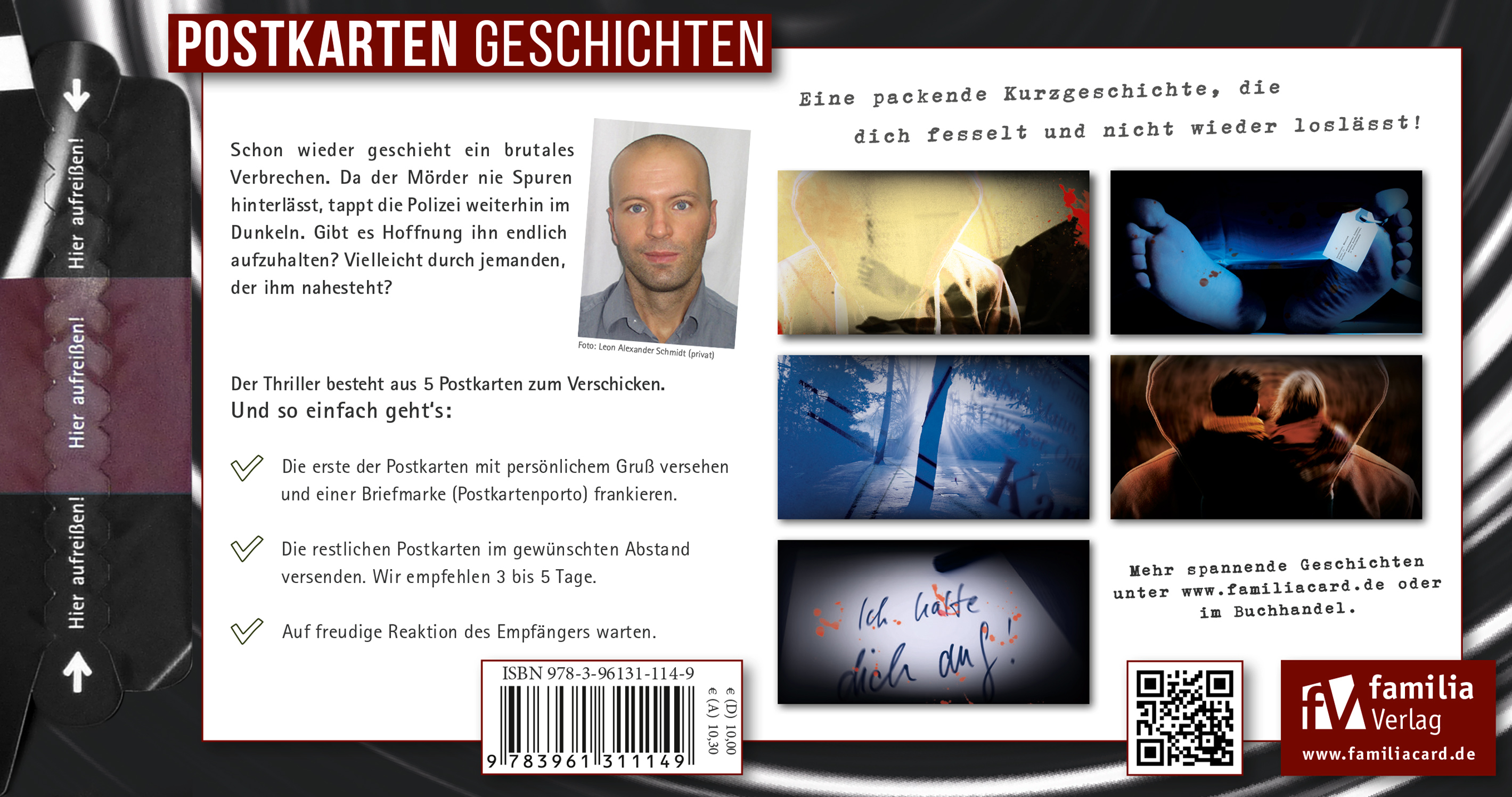 Die POSTKARTE lebt! Verschick doch mal einen THRILLER!Schon wieder geschieht ein brutales Verbrechen. Da der Mörder nie Spuren hinterlässt, tappt die Polizei weiterhin im Dunkeln. Gibt es Hoffnung ihn endlich aufzuhalten? Vielleicht durch jemanden, der ihm nahesteht?Eine packende Kurzgeschichte, die dich fesselt und nicht wieder loslässt!So einfach geht's:Die erste der Postkarten mit persönlichem Gruß und einer Briefmarke (Postkartenporto) versehen.Restliche Karten im gewünschten Abstand versenden. Wir empfehlen 3 bis 5 Tage.Auf freudige Reaktion des Empfängers warten ;-)familia Verlagwww.familiashop.deUmfang: 5 Karten, doppelseitig bedruckt, in gestalteter KartenboxMaße (B/H): 235 mm x 125 mm