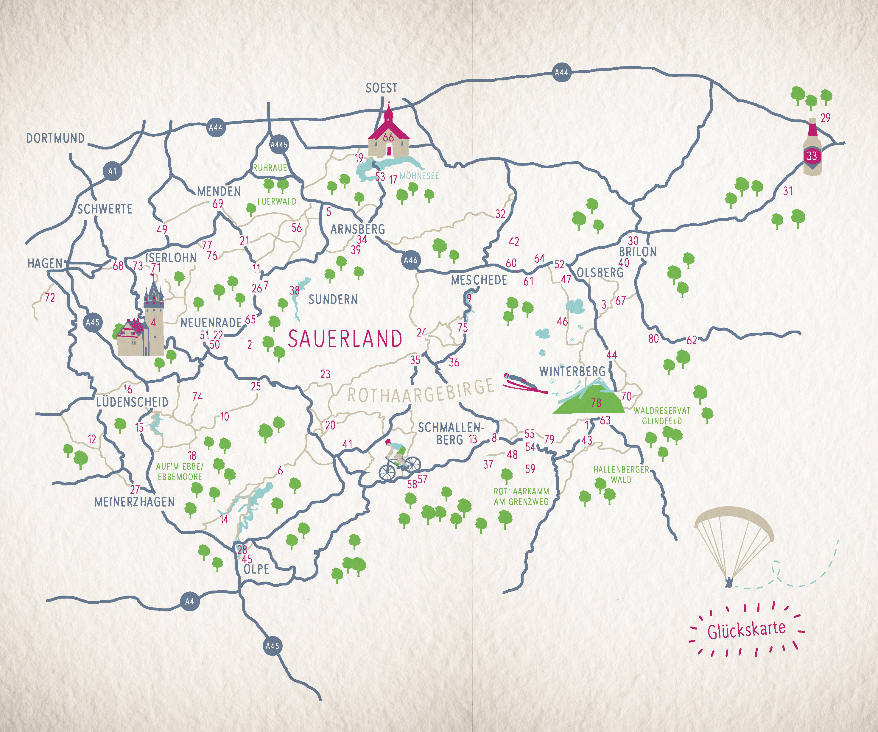 Unser Herz schlägt für das Sauerland! Während das Rothaargebirge berauschende Ausblicke gewährt, lassen geheimnisvolle Höhlen und das kristallklare Wasser unzähliger Stauseen tief blicken. Im Land der tausend Berge gibt es mindestens so viele Glücksorte wie Gipfel: Sagenumwobene Burgen können entdeckt werden, an der Möhnetalsperre lockt der weltbeste Kuchen und Hemer lädt zum sinnlichen Parkspaziergang. Egal, ob im Wald, am Wasser oder in einer der malerischen Kleinstädte - hier findet jeder sein ganz persönliches Glück!