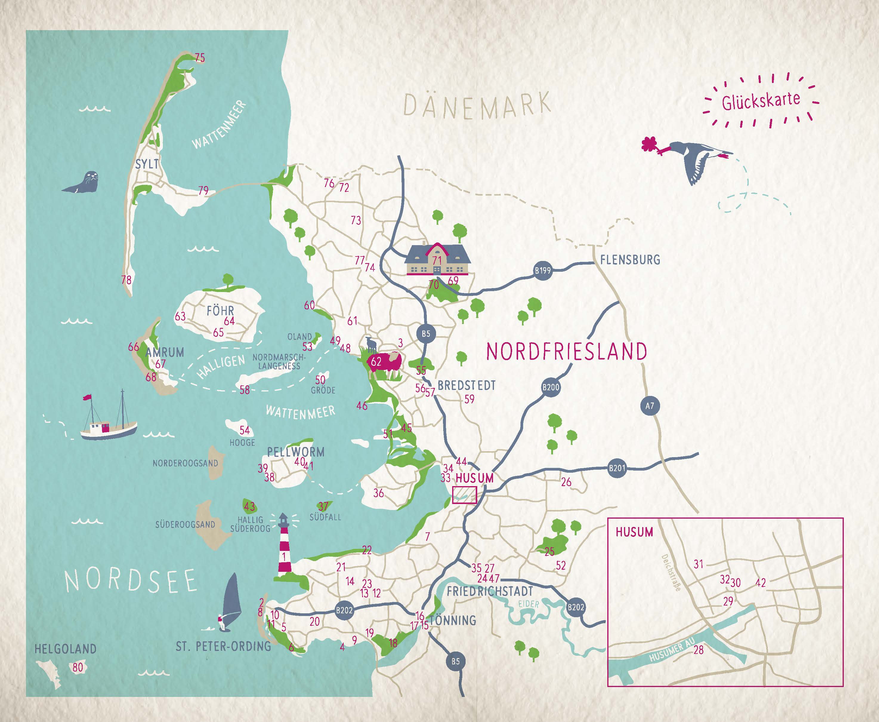 Ob man einem Wattwurm begegnet, eine Trümmertorte vernascht oder sich einfach in den größten Sandkasten der Republik wirft: Die kilometerlangen Sandstrände, sattgrünen Weiden, pittoresken Friesendörfer mit reetgedeckten Kapitänshäusern und das Wattenmeer mit seiner einzigartigen Fauna bilden die perfekte Kulisse für große und kleine Glücksmomente in Deutschlands hohem Norden. Wer hier das Glück sucht, wird zwischen Deich und Dünen auf jeden Fall fündig!