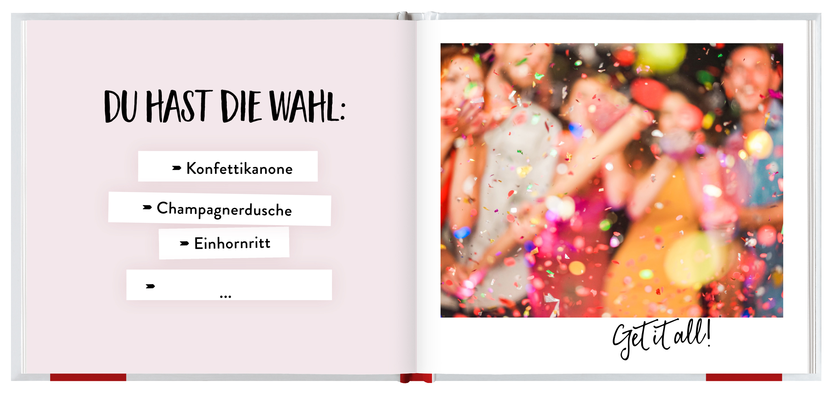 Das Buch enthält viele gute Wünsche und kombiniert diese mit bunten Fotos. Die Texte sind locker und humorvoll formuliert wie zum Beispiel: "Was reimt sich auf Geburtstag? - Champagner! Oder Gin Tonic?". Es ist ein schönes Mitbringsel für eine Geburtstagseinladung oder eine gute Ergänzung zu einem Blumenstrauß.