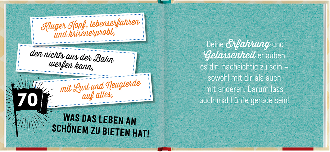 | Schlagworte | 70. geburstatg oma • 70. Geburtstag • 70. geburtstag frau • 70. geburtstag-geschenk • 70. geburtstag mann • 70. geburtstag opa • alles gute zum geburtstag • altern mit Humor • charmante Geburtstagswünsche • farbenfrohe Gestaltung • freudige Botschaft • Geburtstag • Geburtstagsbuch • Geburtstagssprüche • Geburtstagswünsche 70 • Geschenkbuch • geschenkidee für oma • geschenkidee für opa • glückwunsch-buch • glückwünsche zum runden geburtstag • Handliches Format • Humor • Humor im Alter • humorvolle Gratulation • Humorvolle Texte • kleine Aufmerksamkeiten • lustige Geburtstagskarten • Runder Geburtstag • witzige Sprüche |