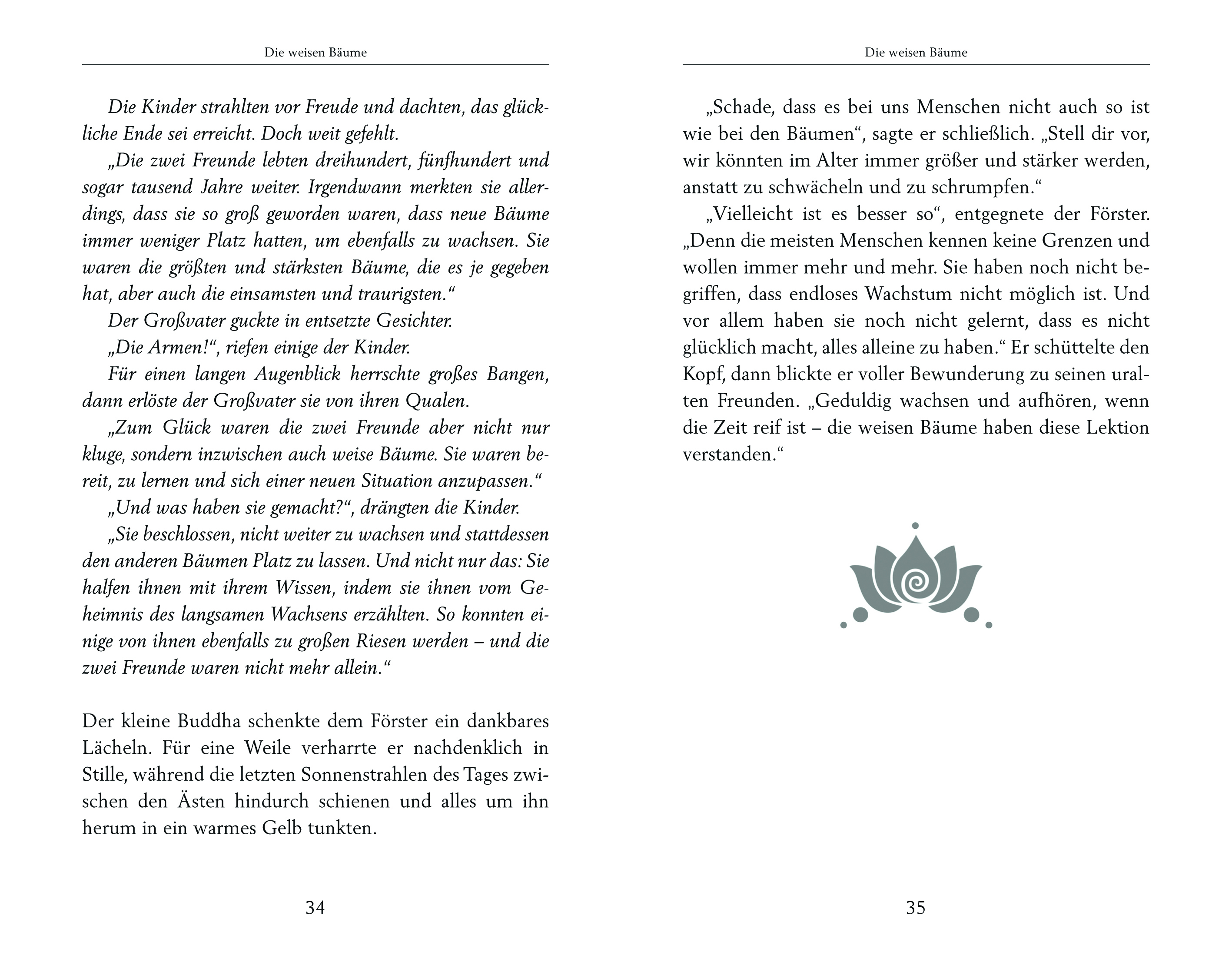 Der kleine Buddha ist zurück! Poetisch und modern illustriert eignen sich die Episoden perfekt zum Verschenken. Im neuen Buch von Claus Mikosch beschäftigt sich der kleine Buddha wieder mit einem großen Lebensthema: der Zeit. Zeit ... was ist das eigentlich? Was bedeutet sie für jeden Einzelnen und warum wird sie so unterschiedlich wahrgenommen? Mal rast sie dahin, mal bleibt sie fast stehen - der kleine Buddha versucht, hinter das Geheimnis der Zeit zu kommen. Beim Apfelpflücken stößt er versehentlich die Leiter um. Während er baumelnd an einem Ast in der Krone des Baumes hängt, wartet er verzweifelt auf Hilfe, denn seine Arme werden immer schwächer und die Zeit scheint ihm unendlich langsam zu vergehen. Glücklicherweise kommt der Gärtner und rettet ihn aus seiner misslichen Lage. Nach diesem Erlebnis beginnt der kleine Buddha über die Zeit nachzudenken. "Ihm wurde fast schwindelig, wenn er daran dachte, wie er durch die Zeit raste. Schon wieder war ein Sommer vorbei, schon wieder nahte der Winter. Jedes Jahr schien alles immer schneller vorbeizugehen! Zumindest die guten Zeiten - schlechte Momente, wie das unfreiwillige Baumeln an einem hohen Ast, waren weiterhin harte Geduldsproben. Warum war das so? Warum konnte er nicht die guten Zeiten langsamer machen und die schlechten beschleunigen? Wie wunderbar wäre es, wenn er besondere Momente kurz anhalten und jegliches Leiden einfach überspringen könnte. Wenn er die Zeit kontrollieren könnte, anstatt ihr hilflos ausgesetzt zu sein. Und dann war da natürlich noch eine andere Frage: Zeit, was ist das überhaupt?" Kurzentschlossen begibt er sich auf Wanderschaft. Auf seiner Suche nach Antworten lernt der kleine Buddha viele neue Freunde kennen und kann beobachten, dass der humpelnde Förster, die träumende Malerin und der gierige Goldgräber ganz unterschiedlich mit ihrer Zeit umgehen. Er sammelt erstaunliche Antworten, die dem immer größer werdenden Wunsch der Menschen nach mehr Zeit und einem klugen Umgang mit ihr helfen können. Am Ende seiner Reise hat der kleine Buddha keine Universalantwort auf die Frage, warum sich das Vergehen von Zeit immer wieder anders anfühlt. Er kommt aber zu der Einsicht, dass - auch wenn man die Zeit nicht verlangsamen oder gar anhalten kann - jeder fast immer selbst entscheiden kann, ob er schnell oder langsam leben möchte. Wieder ist es Claus Mikosch gelungen, durch die Augen des kleinen Buddha einen einfühlsamen Blick auf das wichtige Thema Zeit zu richten. Er inspiriert zu einem weisen Umgang mit dem kostbaren Gut. Und was weise bedeutet, das muss am Ende jeder für sich selbst entscheiden.