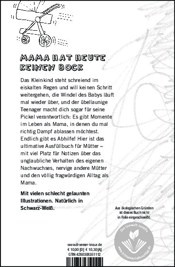 Das Kleinkind steht schreiend im eiskalten Regen und will keinen Schritt weiter gehen, die Windel des Babys läuft mal wieder über und der übellaunige Teenager macht sie sogar für seine Pickel verantwortlich: Es gibt Momente im Leben einer Mutter, in der sie mal richtig Dampf ablassen möchte. Endlich gibt es Abhilfe! Hier ist das ultimative Ausfüllbuch für Mütter, mit dem sie ihren Frust über ihr Dasein und die lieben Kleinen endlich mal ablassen können. Mit viel Platz für Notizen über das unglaubliche Verhalten des Nachwuchses, nervige andere Mütter und den völlig fragwürdigen Alltag als Mama.