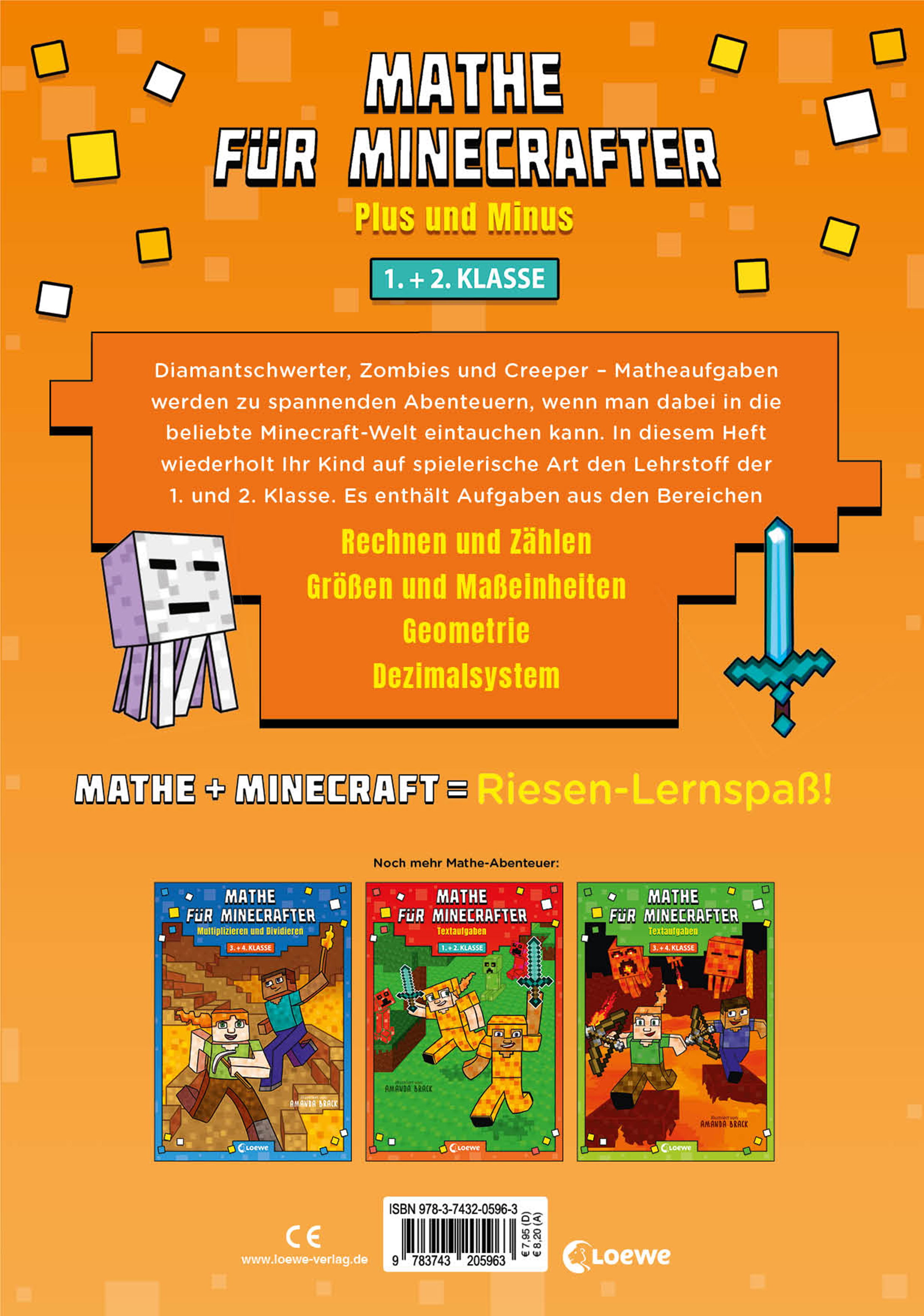 Mit diesen Übungsheften zum Schulfach Mathe wird jeder Minecraft-Fan zum echten Abenteurer. Spannende Aufgaben rund um das Thema Plus und Minus helfen Schülern in der 1. und 2. Klasse, jede Mathe-Klausur zu bestehen. Durch die bekannten Minecraft-Charaktere und -Items, die durch die Aufgaben begleiten, bekommen Kinder ab 6 und 7 Jahren einen ganz eigenen Zugang zum Schulfach und festigen so nebenbei ihr Wissen. So wird jeder Gamer zum Mathe-Ass!