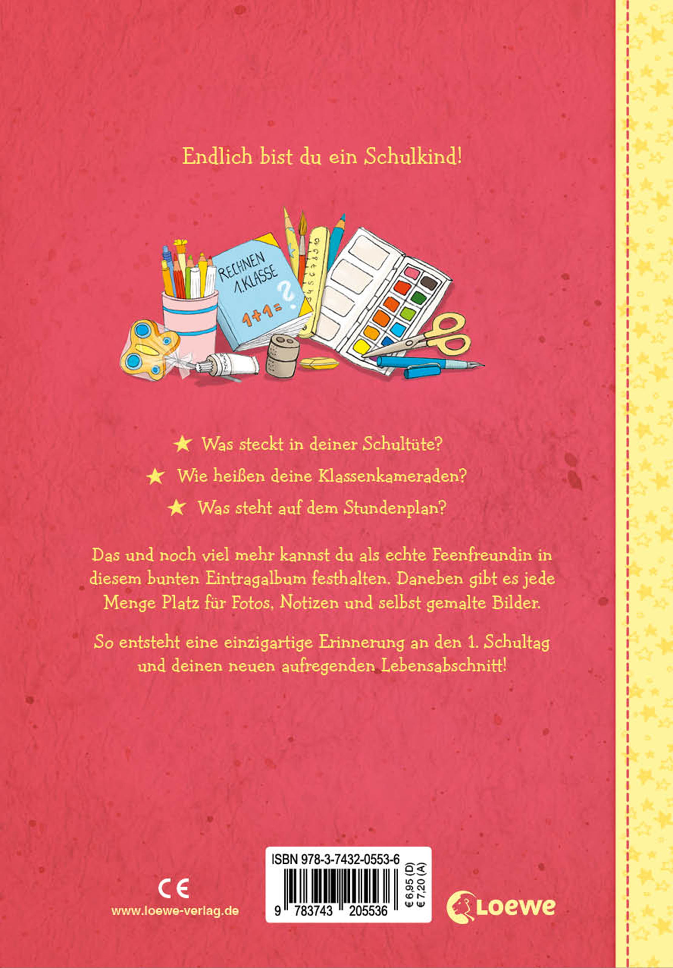 Was steckt in der Schultüte? Wie heißen die neuen Klassenkameraden? Was steht auf dem Stundenplan? Das und noch viel mehr können alle Feenfreunde in diesen fröhlich-bunten Eintragalben festhalten. Daneben gibt es jede Menge Platz für Fotos, Notizen und selbst gemalte Bilder. So entsteht eine einzigartige Erinnerung an den 1. Schultag!