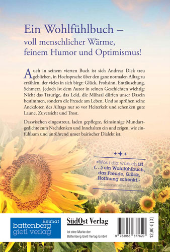Auch in seinem vierten Buch ist sich Andreas Dick treu geblieben, in Hochsprache über den ganz normalen Alltag zu erzählen, der vieles in sich birgt: Glück, Frohsinn, Enttäuschung, Schmerz. Jedoch ist dem Autor in seinen Geschichten wichtig: Nicht das Traurige, das Leid, die Mühsal dürfen unser Dasein bestimmen, sondern die Freude am Leben. Und so sprühen seine Anekdoten des Alltags nur so vor Heiterkeit und schenken gute Laune, Zuversicht und Trost. Dazwischen eingestreut, laden gepflegte, feinsinnige Mundartgedichte zum Nachdenken und Innehalten ein und zeigen, wie einfühlsam und anrührend unser bairischer Dialekt ist - mittlerweile in der 2., erweiterten Auflage!