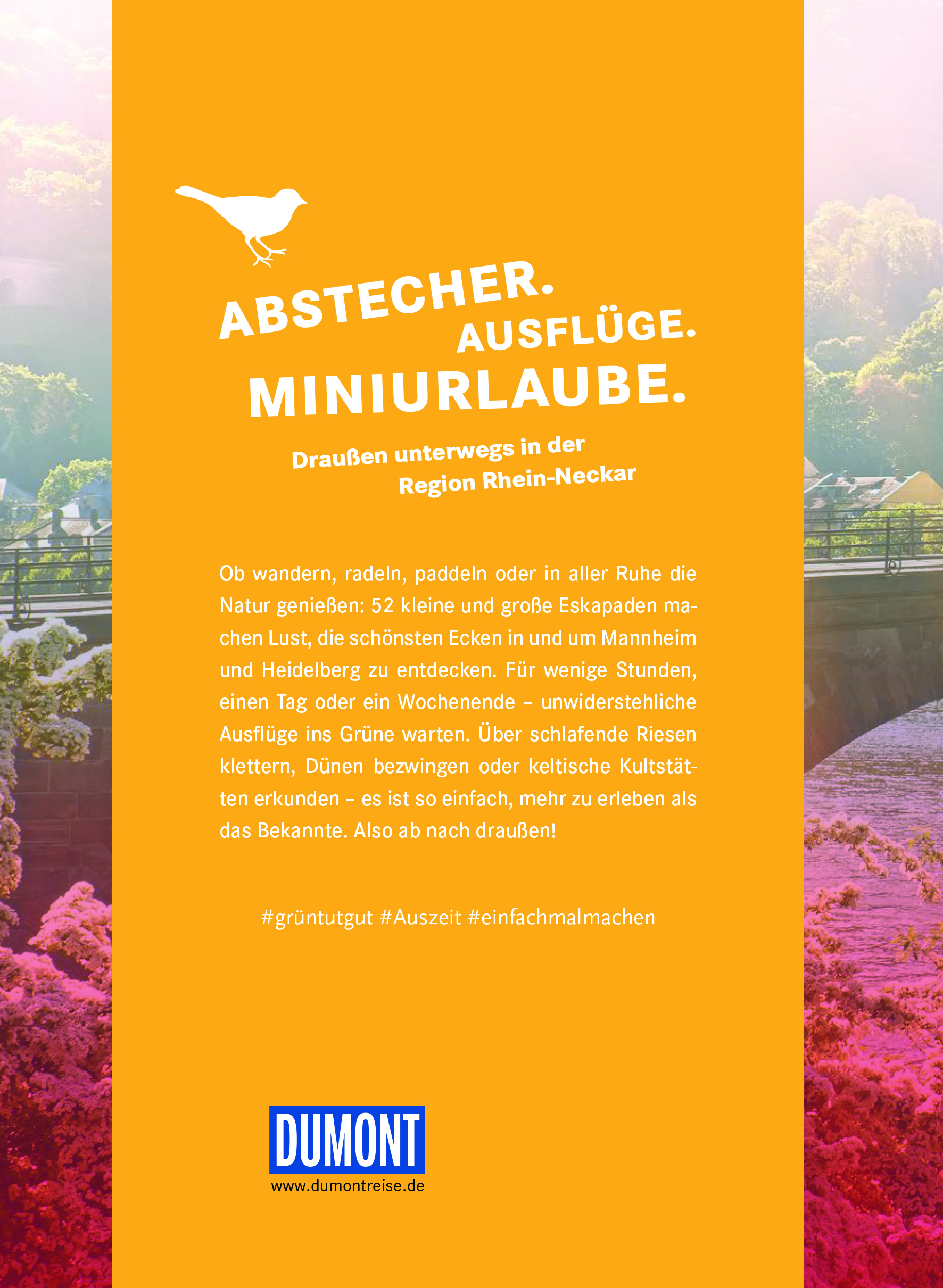 Ob wandern, radeln, paddeln oder in aller Ruhe die Natur genießen: 52 kleine und große Eskapaden machen Lust, die schönsten Ecken in und um Mannheim und Heidelberg zu entdecken. Für wenige Stunden, einen Tag oder ein Wochenende - unwiderstehliche Ausflüge ins Grüne warten. Über schlafende Riesen klettern, Dünen bezwingen oder keltische Kultstätten erkunden - es ist so einfach, mehr zu erleben als das Bekannte. Also ab nach draußen!