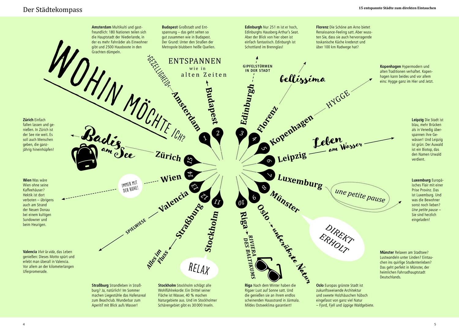 Vorgestellt werden 15 Städte mit besonderer Atmosphäre, viel Grün und einladender Gastronomie. Städte, in denen man wunderbar abschalten und es sich gut gehen lassen kann. In denen du die Wahl hast zwischen Meerespromenaden oder Badestellen am Fluss, Kaffehäusern und Märkten, die zum Naschen verführen und stadtnahen Ausflugszielen. Finde heraus, wie einfach Erholung in der Stadt funktioniert – hinfahren, neugierig sein und einen wunderbaren Mini-Urlaub erleben!