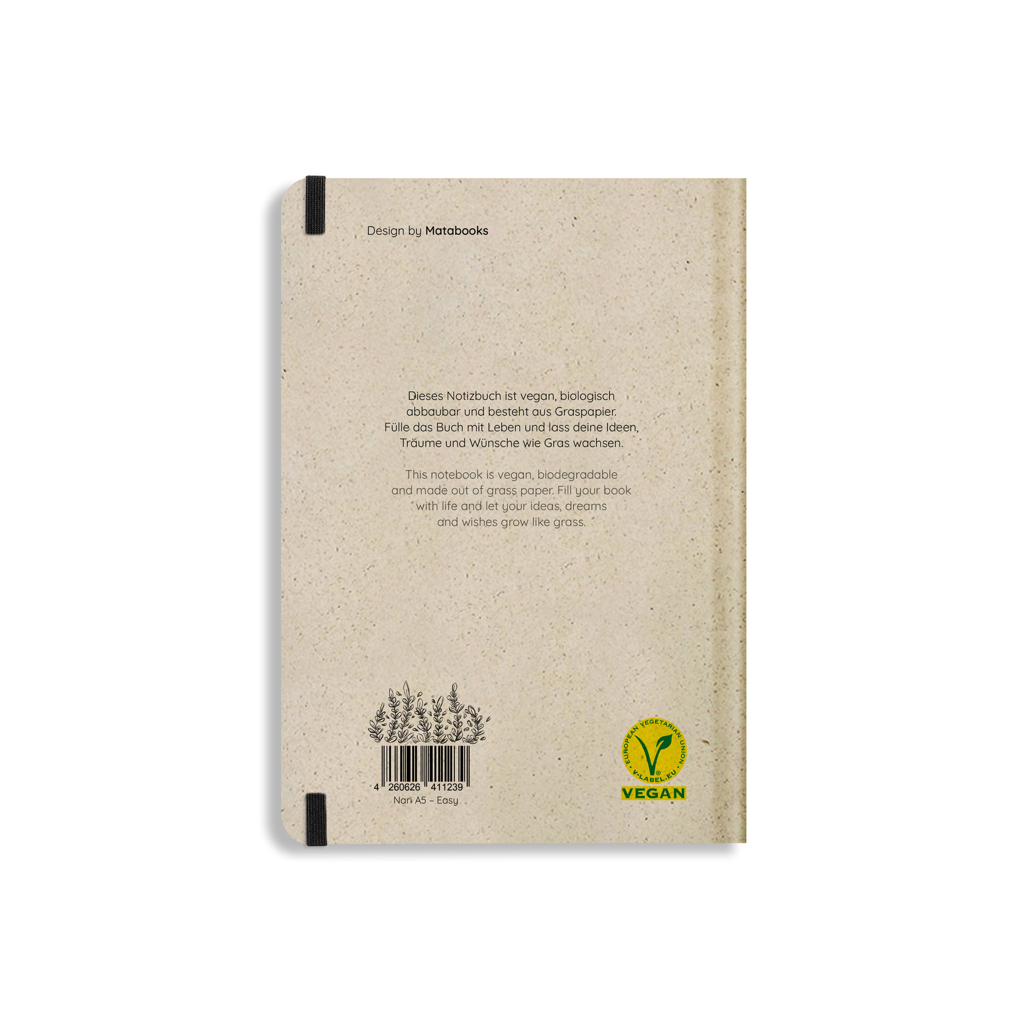 "Nari" stammt aus dem Sanskrit, der heiligen Sprache der Inder, und bedeutet "Frau". Mit diesen umweltfreundlichen Notizbüchern möchten wir die Girl Power bestärken und das Gefühl der Selbstliebe und des Miteinanders feiern, deshalb haben wir uns mit verschiedenen Künstlerinnen zusammengetan und zum ersten Mal Süßgraspapier aus landwirtschaftlichen Abfällen für unsere Bücher verwendet. So vereinen wir in den Naris die Aspekte von Nachhaltigkeit und Female Empowerment.Verwendbar als umweltfreundliches Notizbuch, Bullet Journal (Planer) oder Tagebuch. Perfekt geeignet als nachhaltiges Geschenk für dich und deine Liebsten.Auf dem Süßgraspapier können alle Stifte und Farben verwendet werden, die du dir vorstellen kannst. Dank seiner natürlichen Robustheit franst Tinte nicht aus und drückt auch nicht auf der Rückseite durch.Technische AngabenFormat 21,5 x 14,4 cm, 90 g/m² Süßgraspapier (bestehend aus landwirtschaftlichen Abfällen von z.B. Reis-, Getreide- und Zuckerrohrpflanzen), Hardcover aus Graspapier (bis zu 50% Grasfaseranteil, Frischfaseranteil aus FSC-zertifizierten Wäldern), 138 Seiten punktkariert, OEKO-TEX-zertifiziertes Lesezeichen und Gummiband, Fadenheftung, Öko-Druckfarben.Matabooks - nachhaltig, fair und vegan