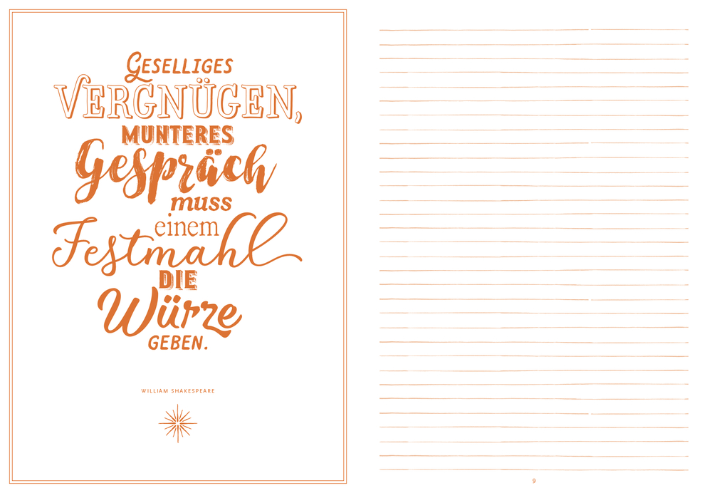 Liebevoll gestaltetes Einschreibheft mit kulinarischen Zitaten und Goldfolienveredelung. Mit separater Zutatenliste und Inhaltsverzeichnis zum Selbstgestalten.
